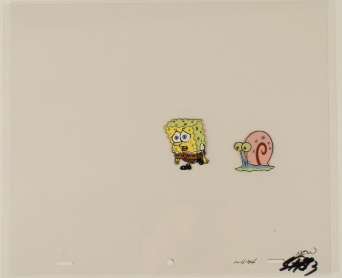 To create production cels, the original animator's drawing is transferred onto an acetate cel (by hand-inking and/or photo copying). The cel is then hand-painted on the reverse side. The cel received by the winning bidder may be ever so slightly different from the one shown in the auction photo.The cel is ready to be matted and framed. The animator's notations are at the bottom of the cel. There is some slight paint fade to SpongeBob's outline. The cel has multiple layers; first is SpongeBob and the second cel is Gary.