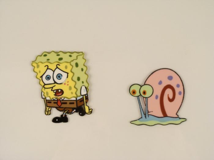 This original animation cel is from the Nickelodeon TV show SpongeBob Squarepants. The story takes place under the deep blue sea in Bikini Bottom, where SpongeBob resides. SpongeBob, who is a yellow, porous sponge, is your typical happy-go-lucky character, as he is always cheerful and enjoys making people laugh. Patrick Star, SpongeBob's neighbor who is a starfish, is your average children's show idiot, as he boasts knowing nothing and is often getting himself into ridiculous situations. Between the homes of these two lies the home of the miserable Squidward, a squid, who is known for being grouchy and playing tricks on SpongeBob and Patrick. Both SpongeBob and Squidward work at the Krusty Krab, a fast food business run by the greedy money-loving Mr. Krabs, a crab, the arch rival of the evil, possibly misunderstood, Plankton. Another neighbor, Sandy Cheeks, an athletic squirrel who normally wears an astronaut's space suit, was introduced in "Tea at the Treedome." She spends most of her time inventing and experimenting. SpongeBob is feeling blue.Original Production Animated Cel Overall Size of Cel: 10 1/2" x 12 1/2" Very Good ConditionThis is an original hand-painted cel set-up used in the production of an episode of "SpongeBob SquarePants." Each one-of-a-kind set-up represents a slight change in position of the characters. When individually photographed and projected in rapid succession, the images appear to move.
