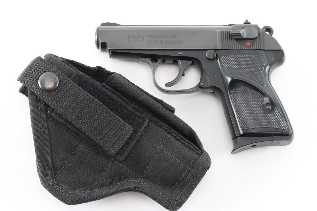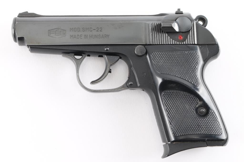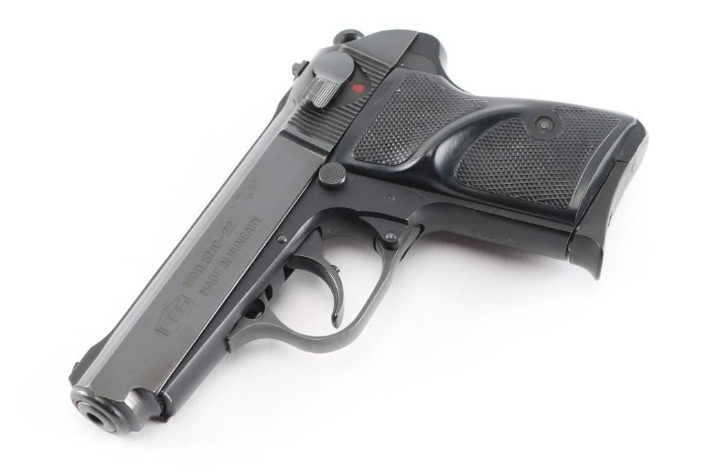 Hungarian made compact pistol, imported by KBI, Inc., Harrisburg PA. chambered in .22LR. Features Walther PPK styling and design influence with a 3 1/4" blued barrel, double action trigger, slide mounted decocking safety, push button mag release, trigger guard hinged for disassembly. Blued finish on slide with three white dot fixed front and rear sights, matching color aluminum alloy frame and a checkered black plastic grips with thumb rest on left side. Bore is very good/bright condition. Retains 90% finish with little handling marks and or edge loss. Grips are in good condition with normal wear. Magazine has a pinky rest base. Includes one 10rd metal magazine and a black nylon holster. Condition is NRA Very Good+*** Modern Firearm ***