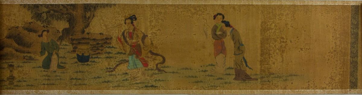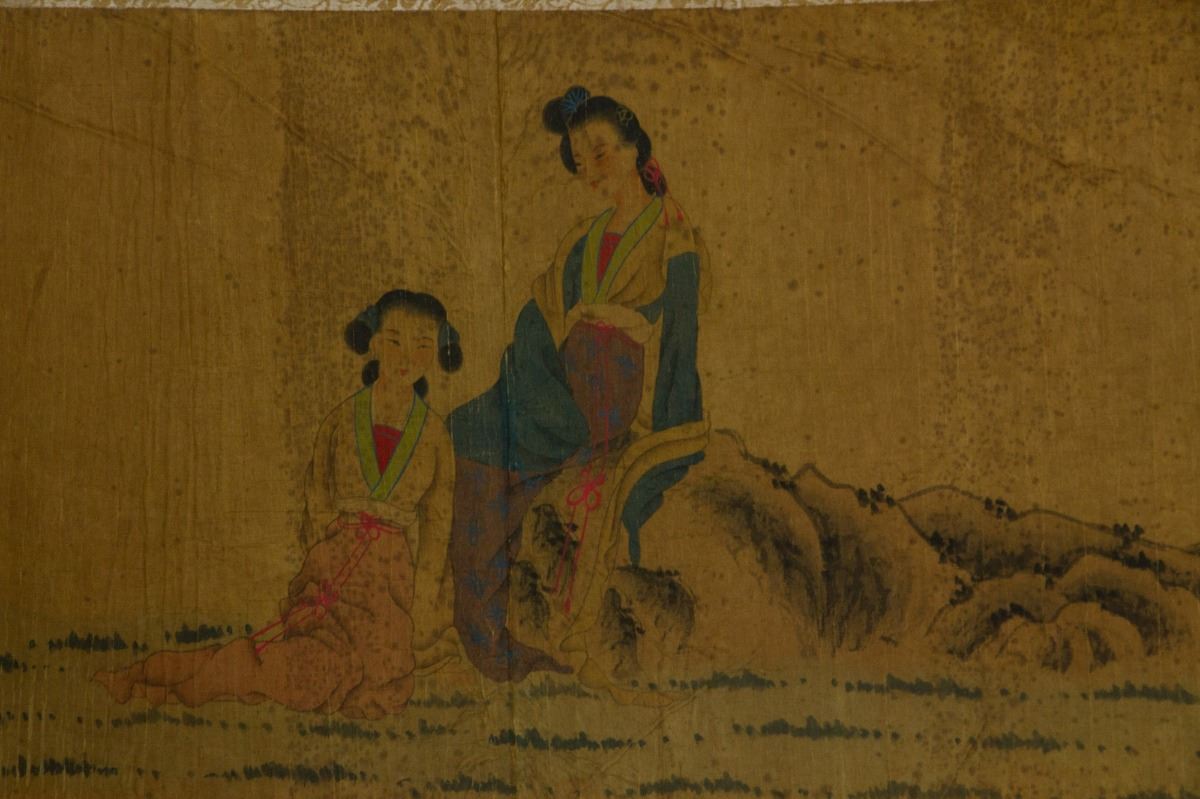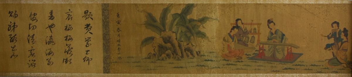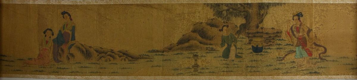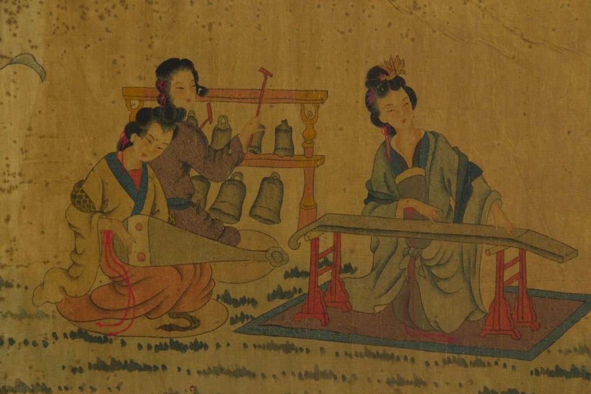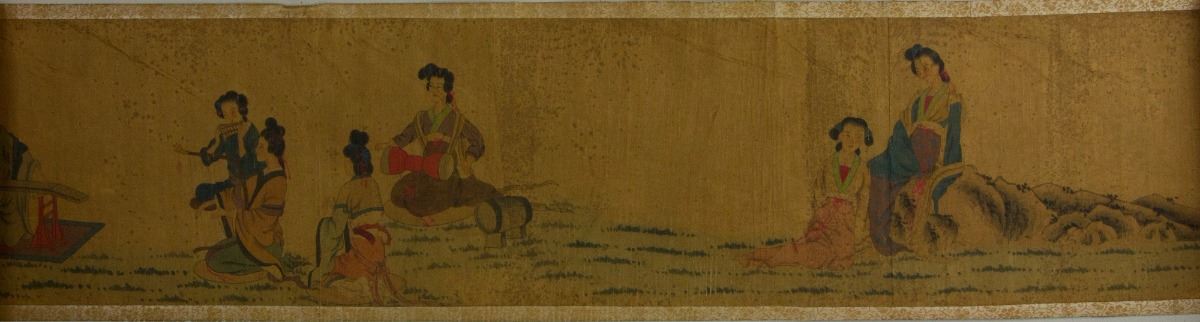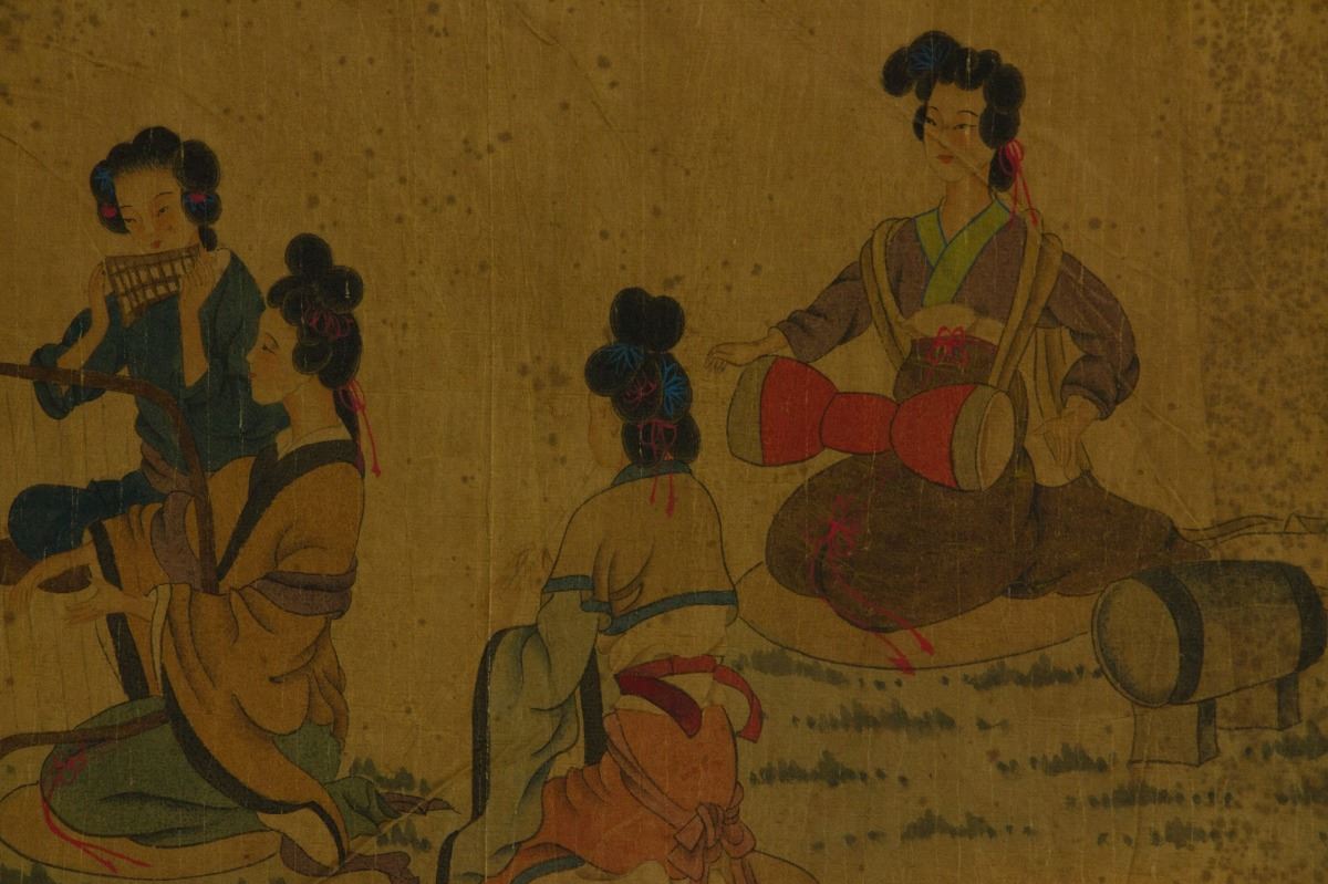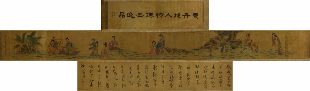 Thirteen young ladies playing musical instruments; Chinese ink and watercolour on paper; hand scroll; signed Fei Danxu (1802-1850); inscribed with 1 artist seal; with cover and comments written by Wu Hu Fan (1894-1968), inscribed with 2 seals; 29 cm × 607 cm