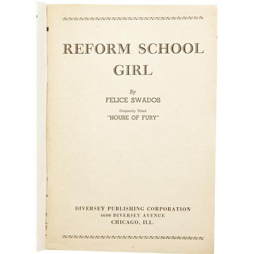 <B>Felice Swados:<I> Reform School Girl.</B></I></B></I> (Chicago: Diversey Publishing Corporation, 1948), reprint of the 1941 Doubleday original <I>House of Fury,</B></I> 128 pages, paperback digest format, 12 (5.25" x 7.5"), in fine condition. A beautiful copy of this controversial pulp novel. Canadian model and ice skating star Marty Collins posed for the cover shot. Her father sued the publisher for defamation and won, causing the publisher to excise the first page of text from this and all volumes. Rare in this condition. <I>From the Ventura Collection.</B></I><BR><BR><b>Shipping:</b> Books & Catalogs (<a target="_blank" href="http://www.heritageauctions.com/common/shipping.php">view shipping information</a>)