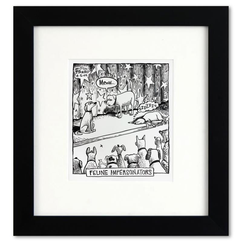 Enter a surreal and satirical world of twisted imagination and award winning creativity. "Feline Impersonators" is an original pen & ink drawing on paper by Dan Piraro, creator of the critically acclaimed and award winning comic strip, Bizarro. This piece is hand signed, comes custom framed and includes a letter of authenticity. Measures approximately 12" x 11" (frame), 7" x 6" (image).This item requires special handling and may have a longer than usual turnaround.