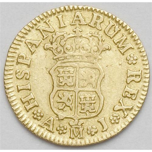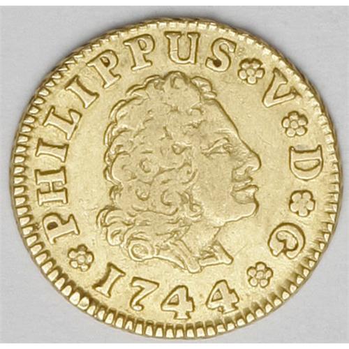 <B>Felipe V gold 1/2 Escudo 1744M-AJ, </B></I>KM361.1, VF-XF, nice details and a trace of luster on the obverse.