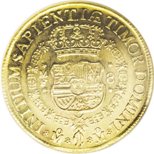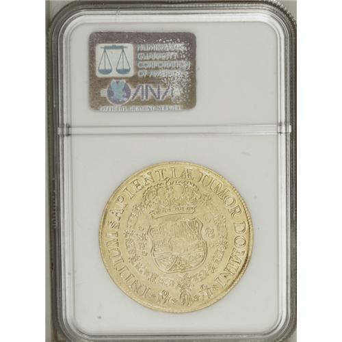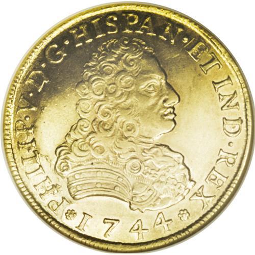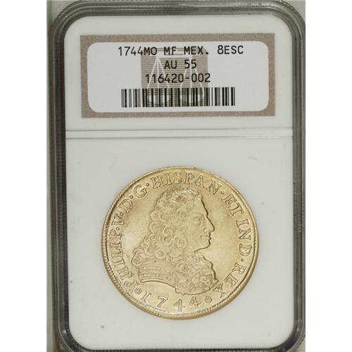 <B>Felipe V gold 8 Escudos 1744-MF, </B></I>KM148, AU55 NGC, a superb example of this appealing type with virtually full mint luster and bold design features. Rare and very desirable in this premium designation.