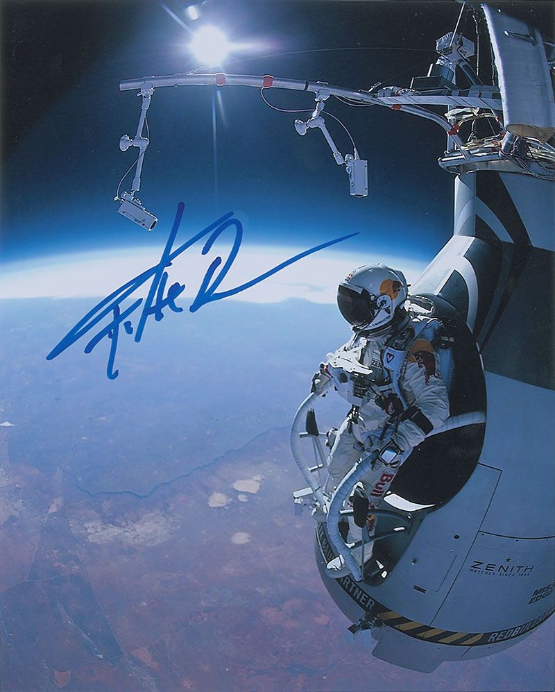 Stunning color satin-finish 8 x 10 photo of Baumgartner emerging from his capsule and preparing to jump, signed in blue felt tip. In very fine condition.