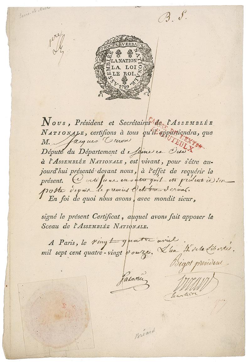 French politician (1747-1825). Partly-printed DS, in French, signed “Bigot president,” one page, 8 x 12, April 24, 1792. Untranslated National Assembly document, bearing the rare vignette “La Nation, La Loi, Le Roi,” at the top, signed by Bigot as assembly president. Several small pencil notations, vertical ink line through body of text, and a rough left edge, otherwise fine condition. The white paper seal is crisp and intact. RRAuction COA.