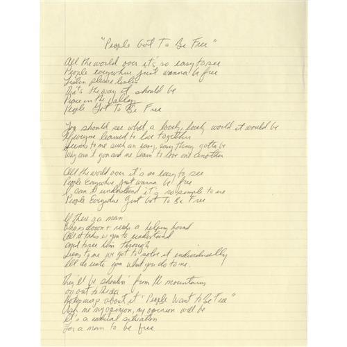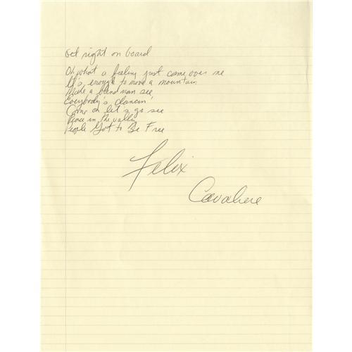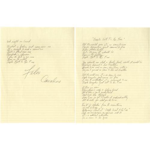 <B>Felix Cavaliere "People Got to Be Free" Handwritten Lyrics.</B></I> Two sheets of notebook paper with lyrics for the Rascals anthem, inspired by the assassination of Robert Kennedy, handwritten and signed on the second page by Felix Cavaliere in black ballpoint. In Excellent condition.<BR><BR><b>Shipping:</b> Flat Material, Small (<a target="_blank" href="http://www.heritageauctions.com/common/shipping.php">view shipping information</a>)