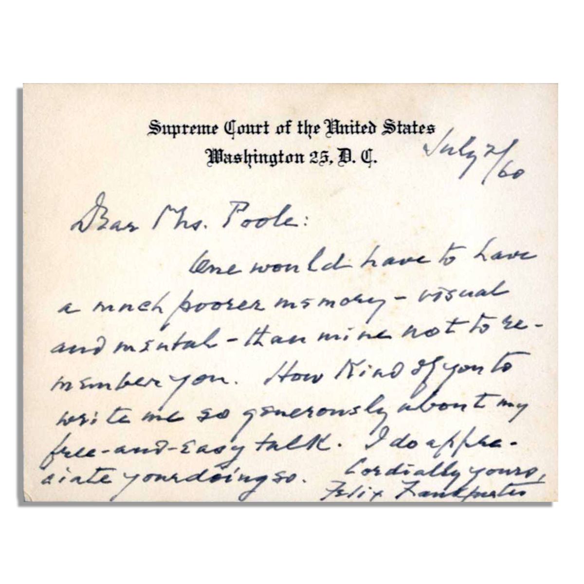 Felix Frankfurter autograph note signed, dated 2 July 1960, on a Supreme Court of the United States note card. Frankfurter's note reads in part: ''Dear Mrs. Poole: One would have to have a much poorer memory - visual and mental - than mine not to remember you. How kind of you to write me so generously about my free-and-easy talk…[signed] Felix Frankfurter''. The Associate Justice would retire two years later, after serving on the bench for twenty-three years. Glue residue to verso of the 4.5'' x 3.5'' card, else very good condition.