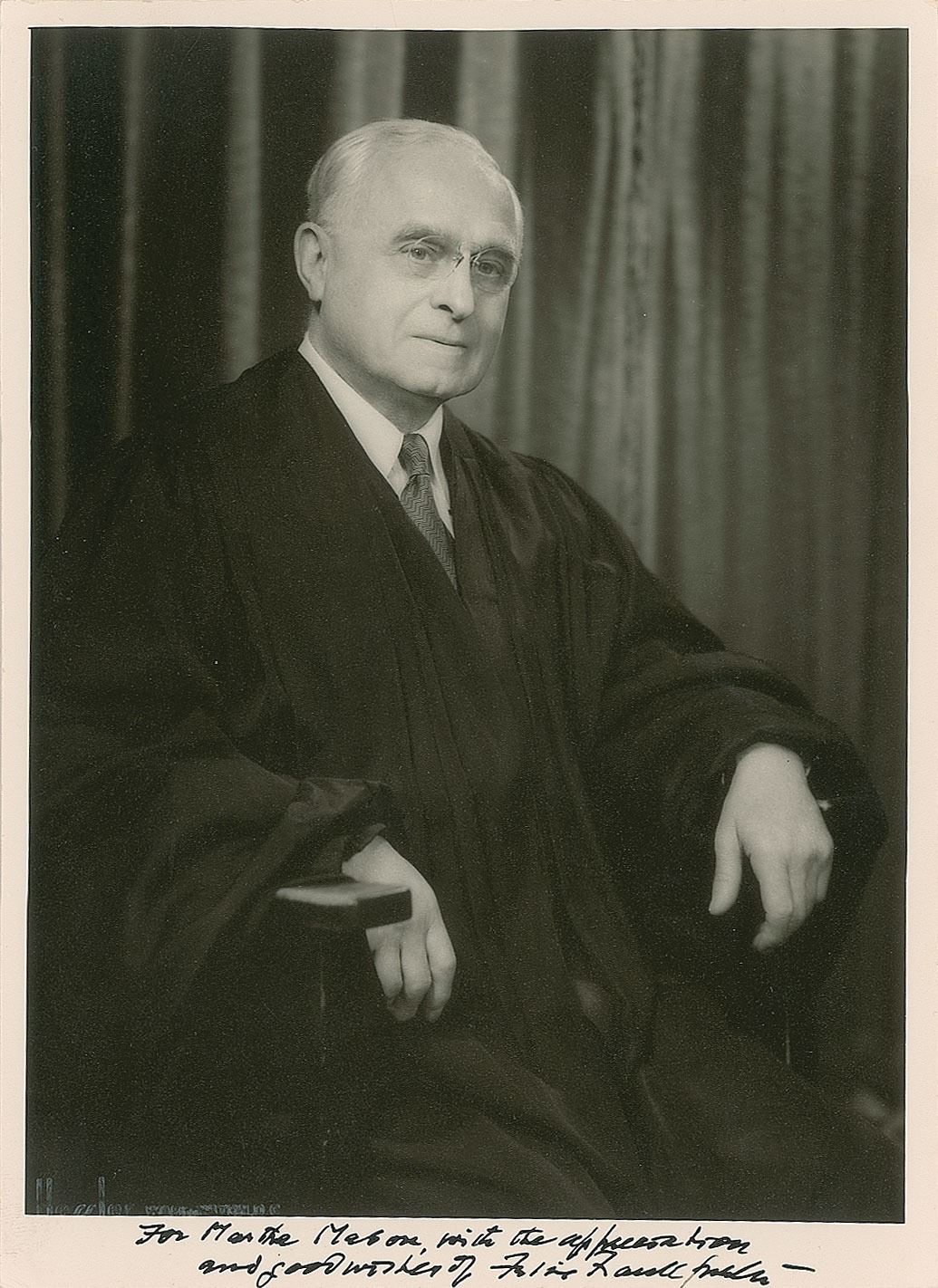 Vintage matte-finish 7 x 9.5 photo of Associate Justice Frankfurter in his judicial robe by Hessler of Washington, boldly signed and inscribed in the lower border in fountain pen, "For Martha Mason, with the appreciation and good wishes of Felix Frankfurter.” Blindstamped in the lower left corner by the studio. In fine condition.