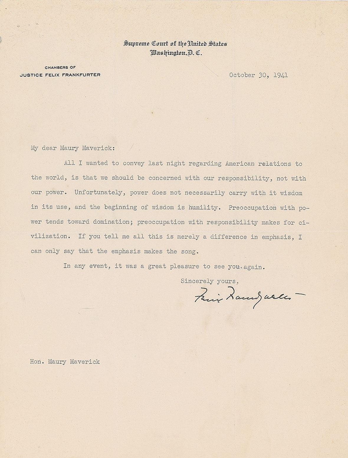TLS, one page, 8 x 10.5, Supreme Court of the United States letterhead, October 30, 1941. Letter to the Hon. Maury Maverick, in part: "All I wanted to convey last night regarding the American relations to the world, is that we should be concerned with our responsibility, not with our power. Unfortunately, power does not necessarily carry with it wisdom in its use, and the beginning of wisdom is humility. Preoccupation with power tends toward domination; preoccupation with responsibility makes for civilization. If you tell me all this is merely a difference in emphasis, I can only say that the emphasis makes the song." In fine condition.