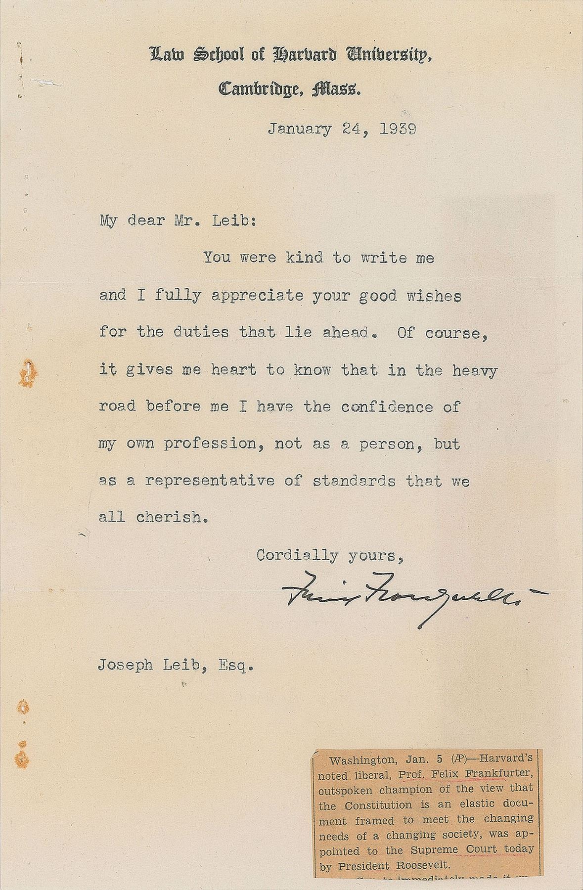 TLS, one page, 5.25 x 8, Law School of Harvard University letterhead, January 24, 1939. Letter to journalist Joseph Leib, in full: "You were kind to write me and I fully appreciate your good wishes for the duties that lie ahead. Of course, it gives me heart to know that in the heavy road before me I have the confidence of my own profession, not as a person, but as a representative of standards that we all cherish." A newspaper clipping is affixed to the lower right corner. In fine condition, with stale holes along the left edge, and light show-through from a clipping attached to the back. President Franklin D. Roosevelt nominated Frankfurter on January 5, 1939, to fill the seat on the Supreme Court vacated by Benjamin Cardozo. Frankfurter was one of the first nominees to appear at a hearing of the Senate Judiciary Committee and he was approved by the full Senate on January 17, 1939.