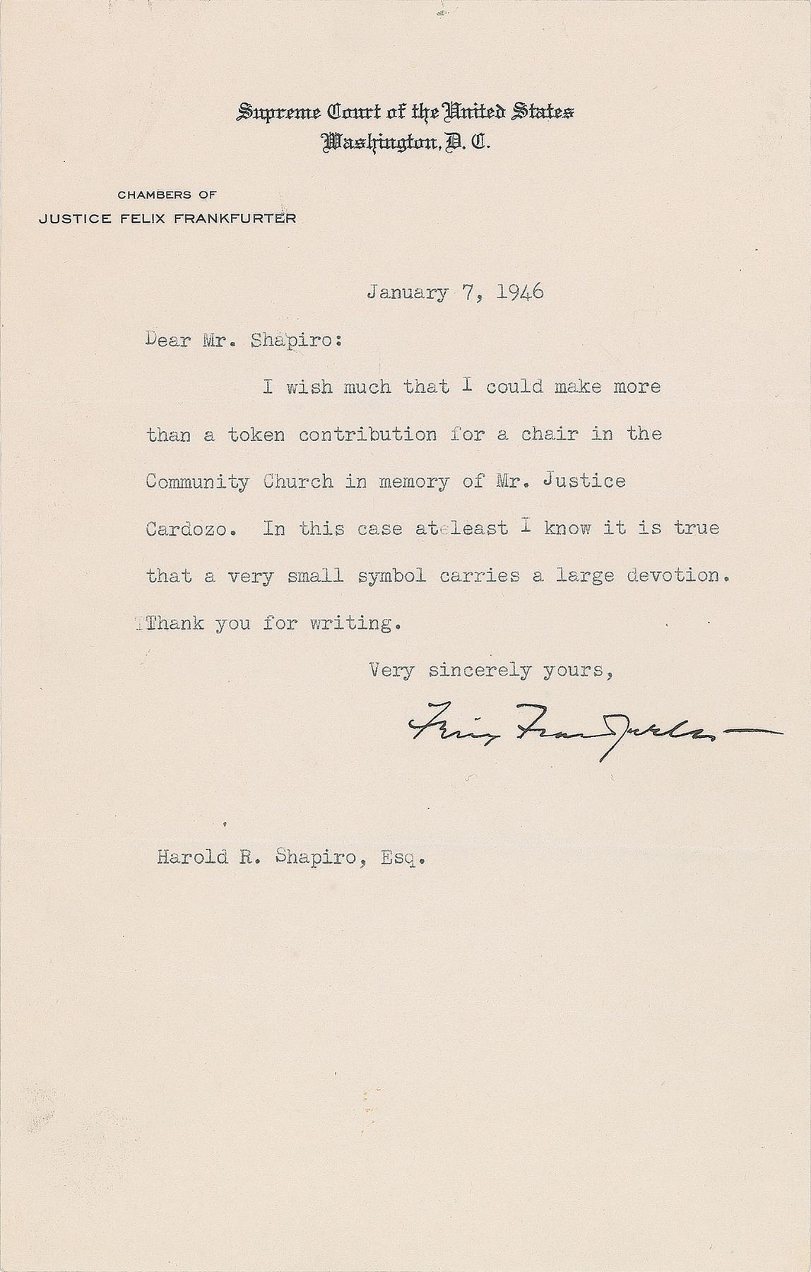 TLS, one page, 5.75 x 9, Supreme Court of the United States letterhead, January 7, 1946. Letter to Harold R. Shapiro, in full: "I wish much that I could make more than a token contribution for a chair in the Community Church in memory of Mr. Justice Cardozo. In this case at least I know it is true that a very small symbol carries a large devotion. Thank you for writing." In fine condition.