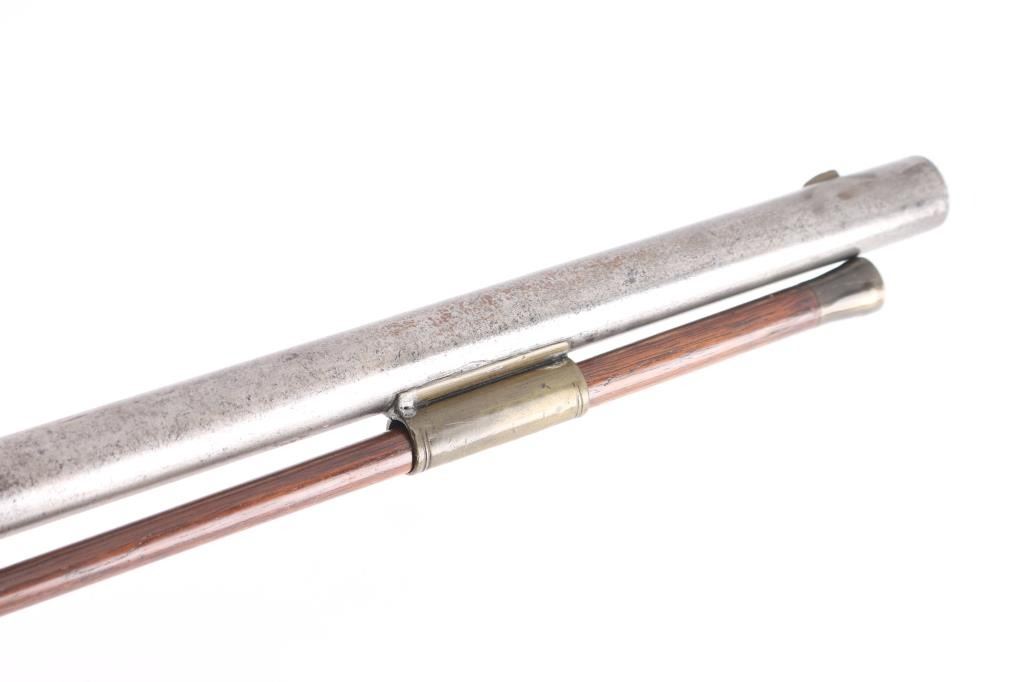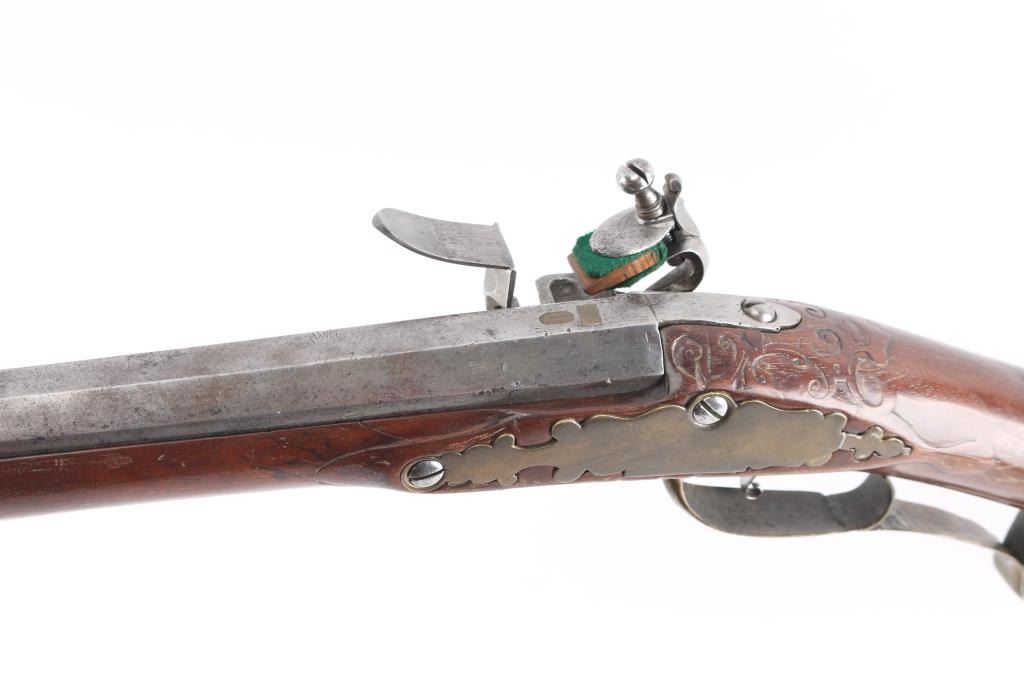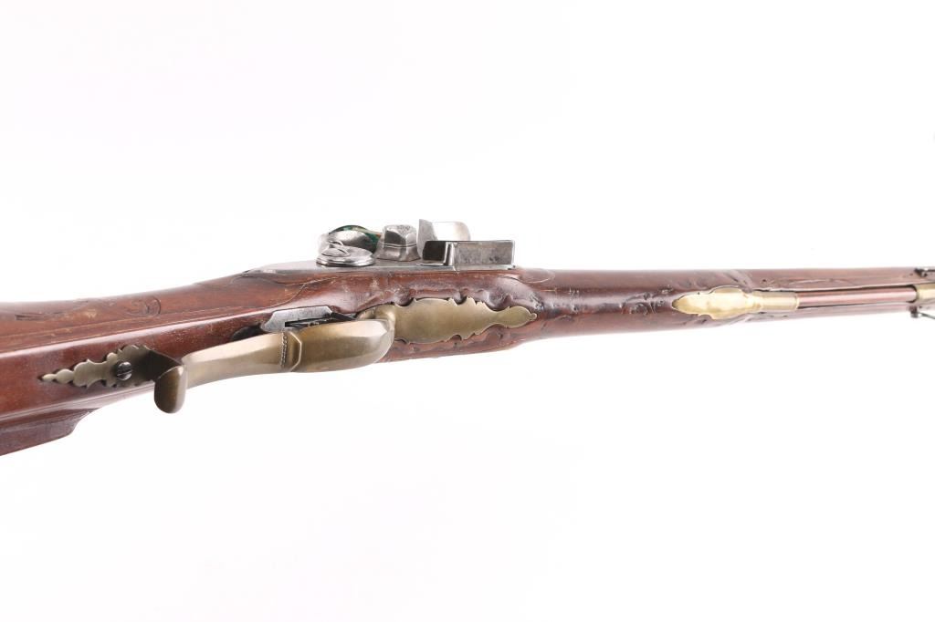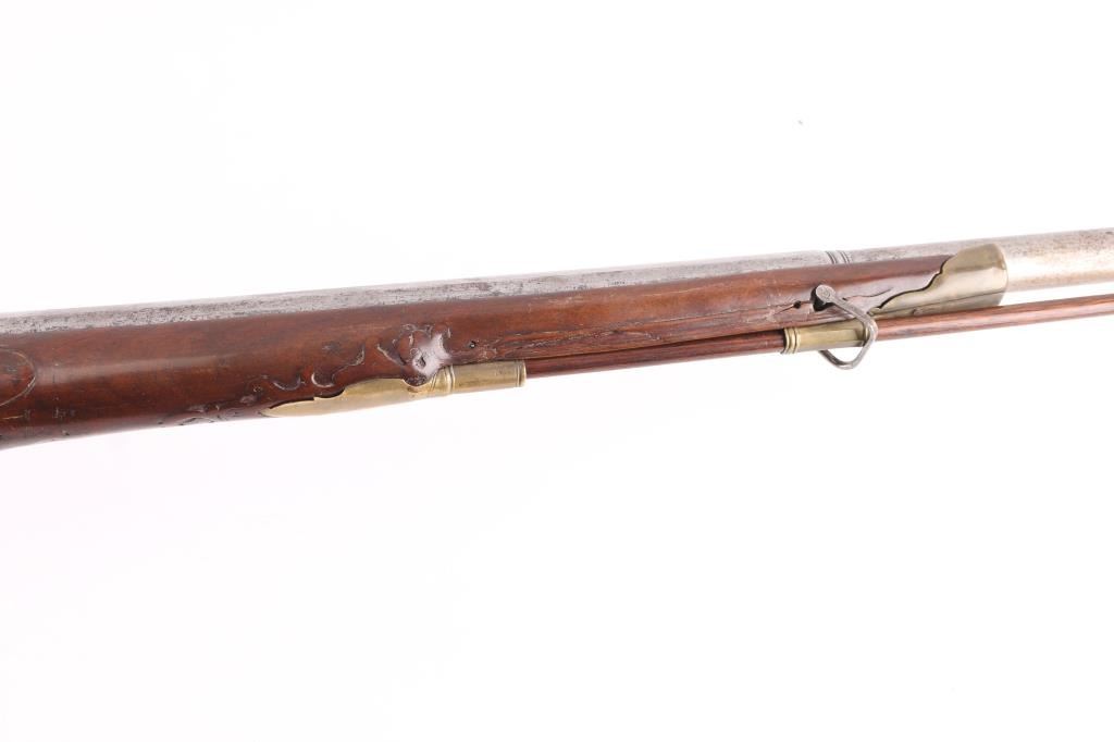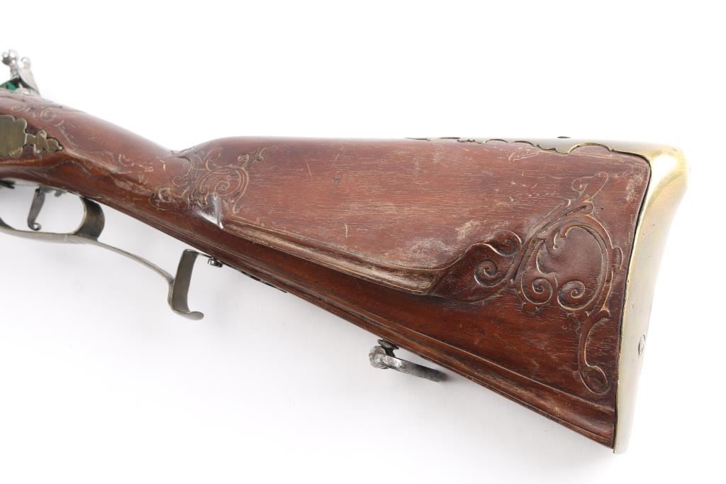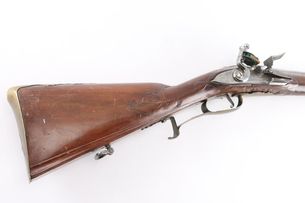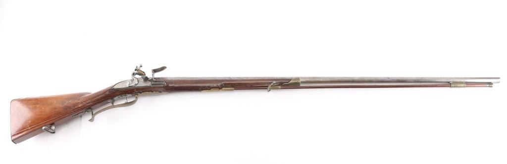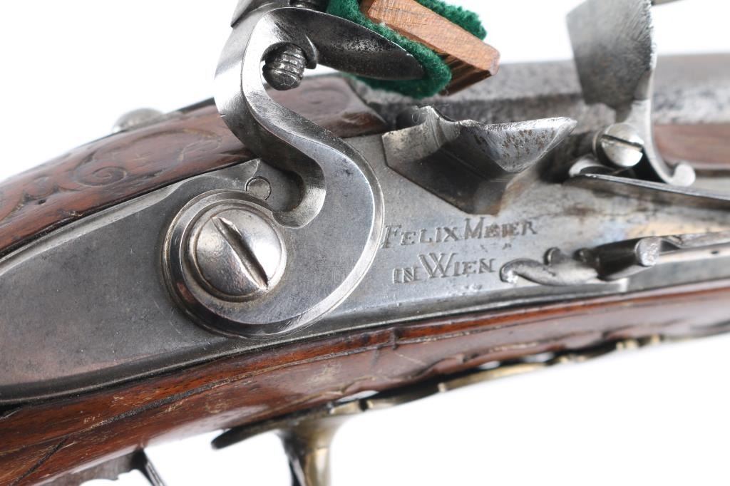 Early and original flintlock fowling piece signed Felix Meier in Wien (Vienna, Austria) on the lock plate. A well known royal gun maker circa 1730-1750. Original very good plus condition showing nicely raised , incised carving, and molding on the guns furniture reminiscent of the fine American makers of the same era working in Pennsylvania. Fine two stage ,octagonal/round 40 1/4" barrel with the goldmark of the maker Andreas M. Sigl, and a gold mark with a horse over the chamber. Original flintlock parts and good bright metal finish showing just minor pitting, some minor wood restoration but great wood to metal fit and well defined carving. Action works well, correct style ramrod, brass fittings, sling swivels. A German immigrant would have carried such a gun to America in the 18th century and many of this type were used in the French & Indian war, and the American revolution. 55 1/2" overall.