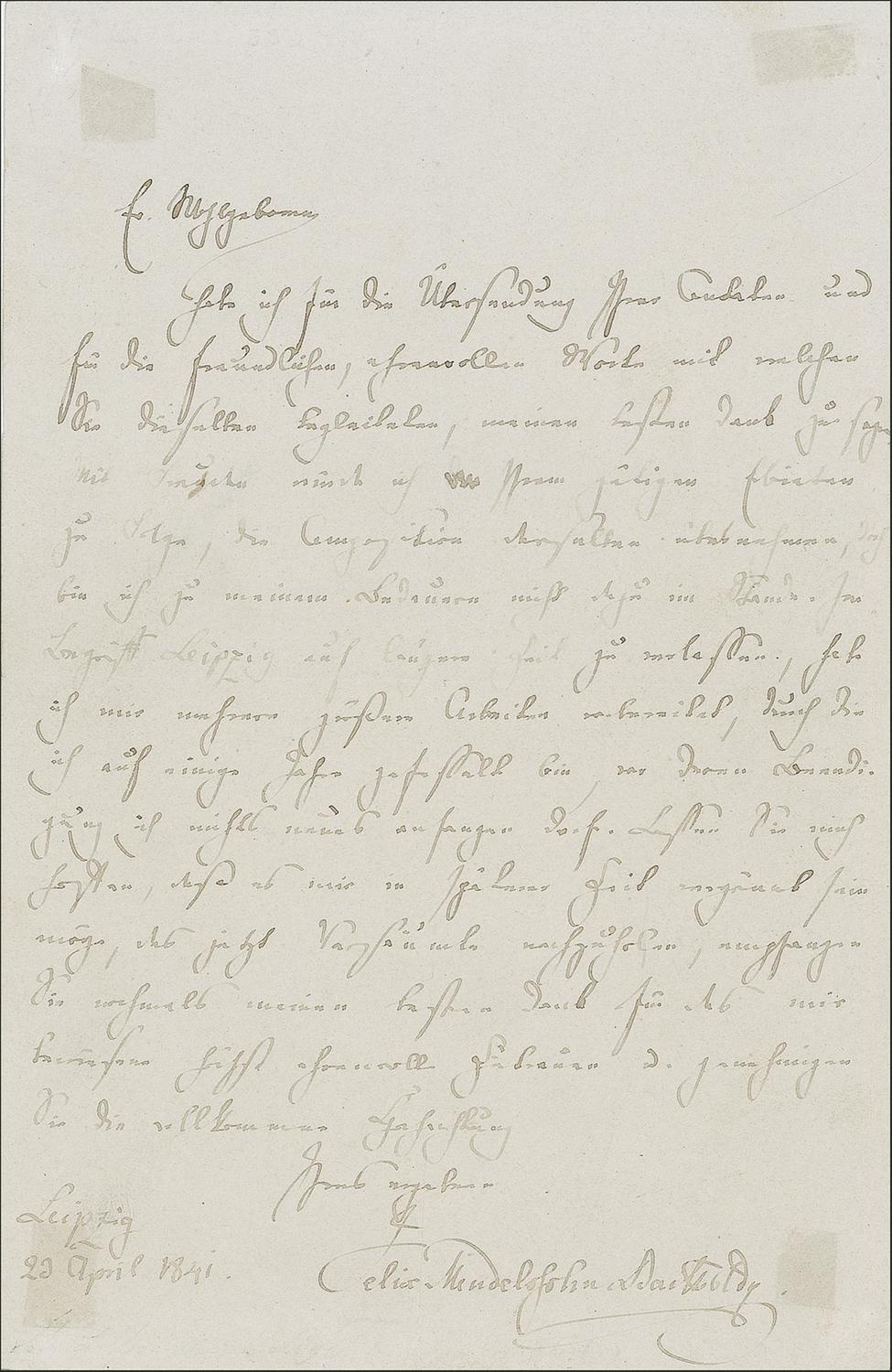 Mendelssohn had conducted the premiere of Robert Schumann’s ‘Spring Symphony’ just a few weeks before dispatching this letter shortly before leaving for Leipzig, Germany “for an extended period.” That excursion included participating in a revival of Bach’s ‘Saint Matthew Passion’ at St. Thomas's Church. His visit to Leipzig ended later that summer upon his appointment as court composer to Friedrich Wilhelm IV of Prussia. A regretful decline by the composer who at the time was overwhelmed by the work at hand.