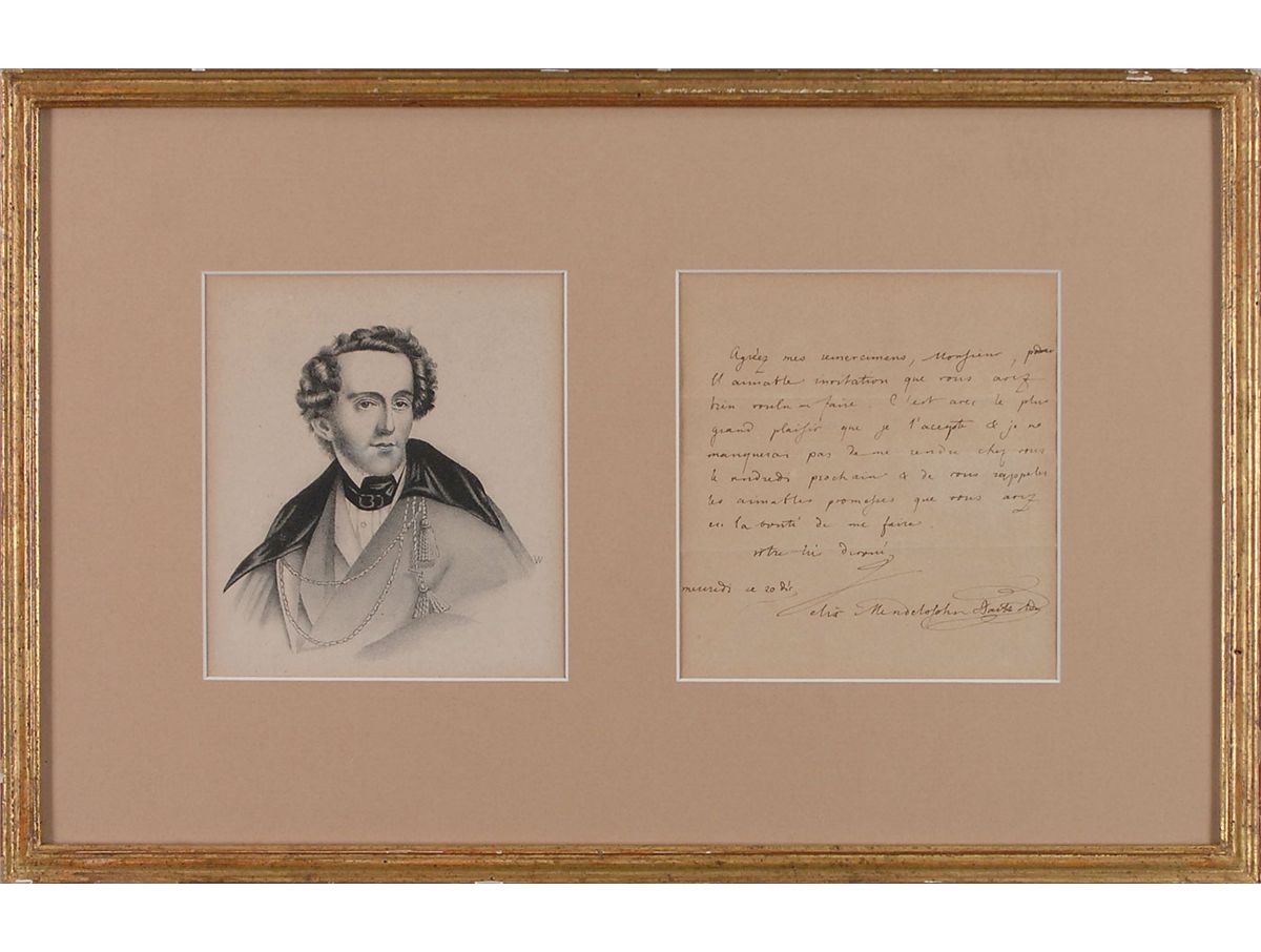 Prodigiously gifted German Romantic composer (1809–1847). His musical output represents virtually every form and genre of the era, ranging from piano and chamber music to symphonies and other orchestral music to such large-scale choral masterpieces. ALS in French, one page, 5 x 5.25, no date. Letter of thanks to an unidentified recipient for an invitation noting that he is pleased to accept it and will come next Friday. Matted and framed with a portrait of the composer to an overall size of 16.25 x 10.5. Uniform toning, and intersecting folds, one through a single letter of signature, otherwise fine condition.
