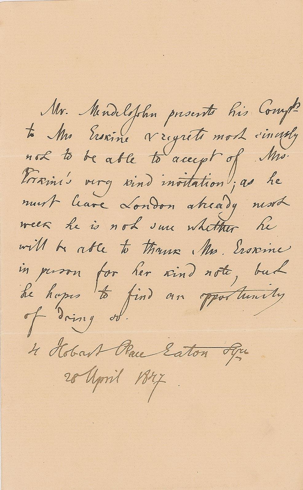Third-person ALS, signed within the text, “Mr. Mendelssohn,” one page, 4.25 x 7, April 28, 1847. Letter to Mrs. Erskine, possibly the wife of the Scottish orientalist and historian William Erskine, in full: "Mr. Mendelssohn presents his Compts. to Mrs. Erskine & regrets most sincerely not to be able to accept of Mrs. Erskine’s very kind invitation; as he must leave London already next week he is not sure whether he will be able to thank Mrs. Erskine in person for her kind note, but he hopes to find an opportunity of doing so." In fine condition. Mendelssohn was known to have been in London in April 1847, to hear Jenny Lind sing in Meyerbeer’s Robert le Diable. Mendelssohn greatly admired Lind and in the 1840s she became a protégée—it was rumored that in 1847 he had written to her to suggest an elopement, though she was married at the time. Accompanied by a full letter of authenticity from PSA/DNA.