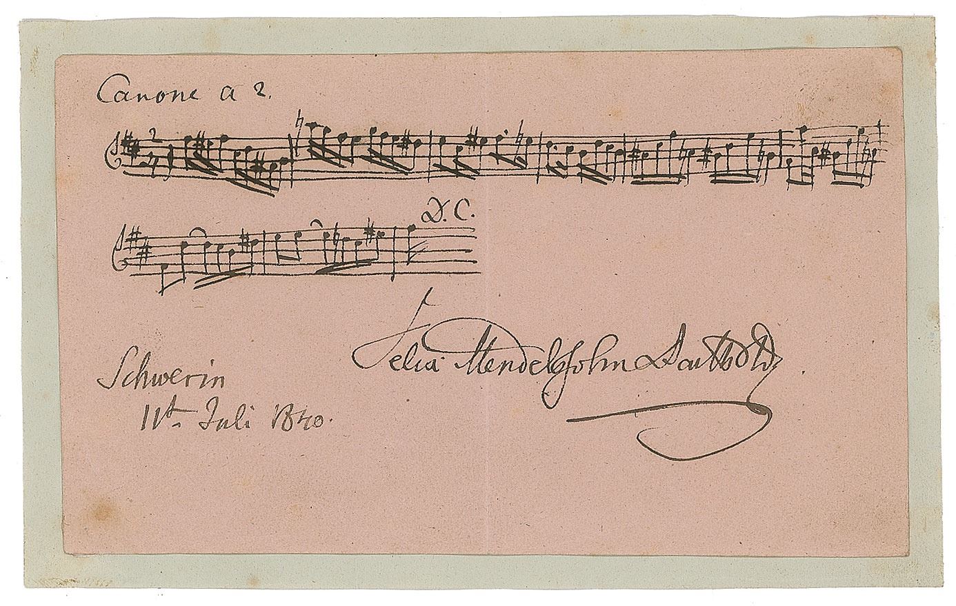 Boldly penned AMQS on a light pink 5.5 x 3.25 album page, boldly signed and dated below in ink, "Felix Mendelssohn-Bartholdy, Schwerin, 11 Juli 1840." Mendelssohn-Bartholdy pens nine bars of fast-paced music from his "Canone a 2" in B minor. Affixed to a slightly larger page and in very good to fine condition, with a central vertical fold, and light toning at the corners from mounting on the reverse.
