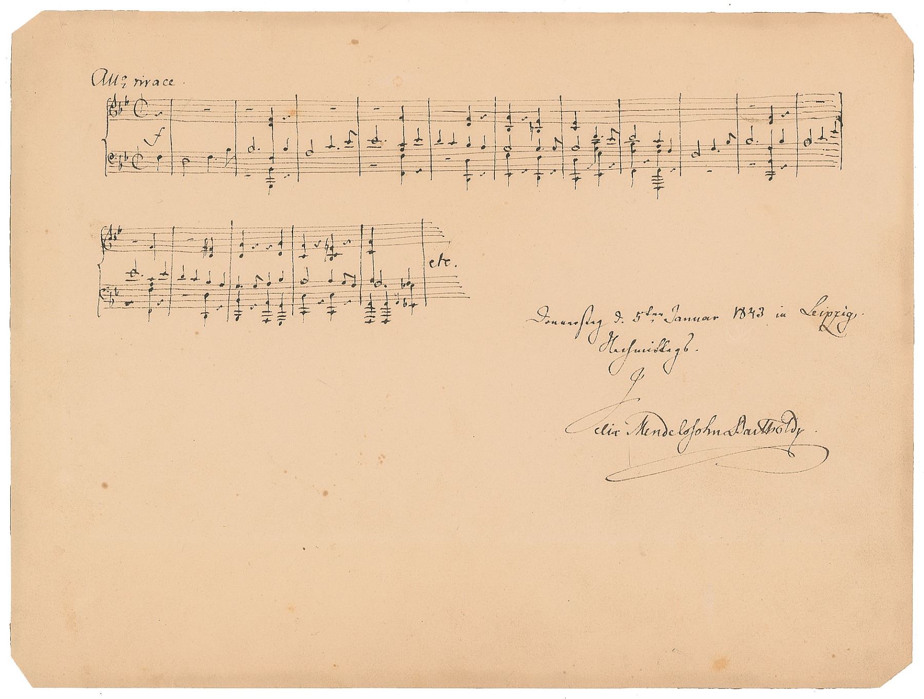 Magnificent boldly penned AMQS on an off-white 10.75 x 8 sheet, boldly signed and dated below in ink, "5th Januar 1843 in Leipzig… Felix Mendelssohn-Bartholdy,” who pens 17 bars on two staves of fast-paced music from an unknown work. In fine condition.