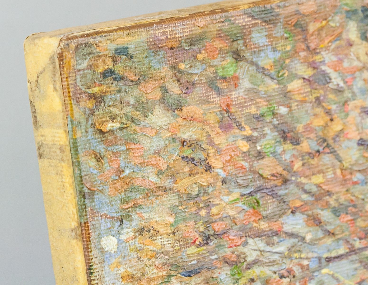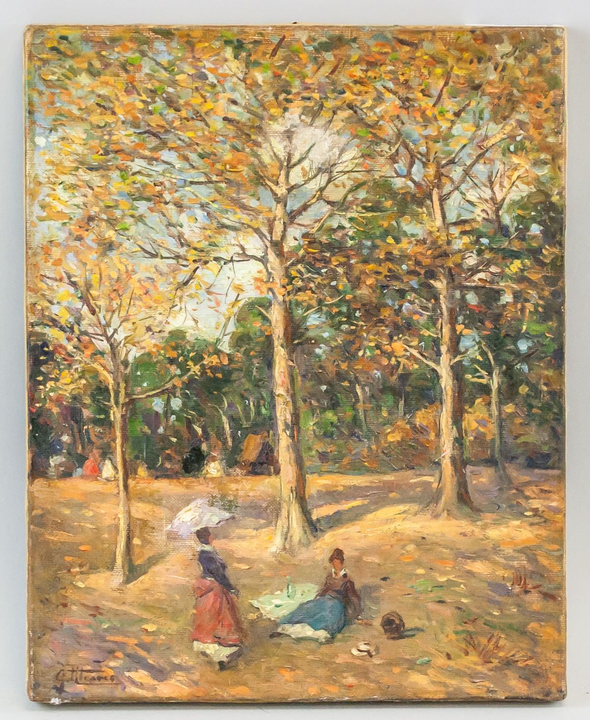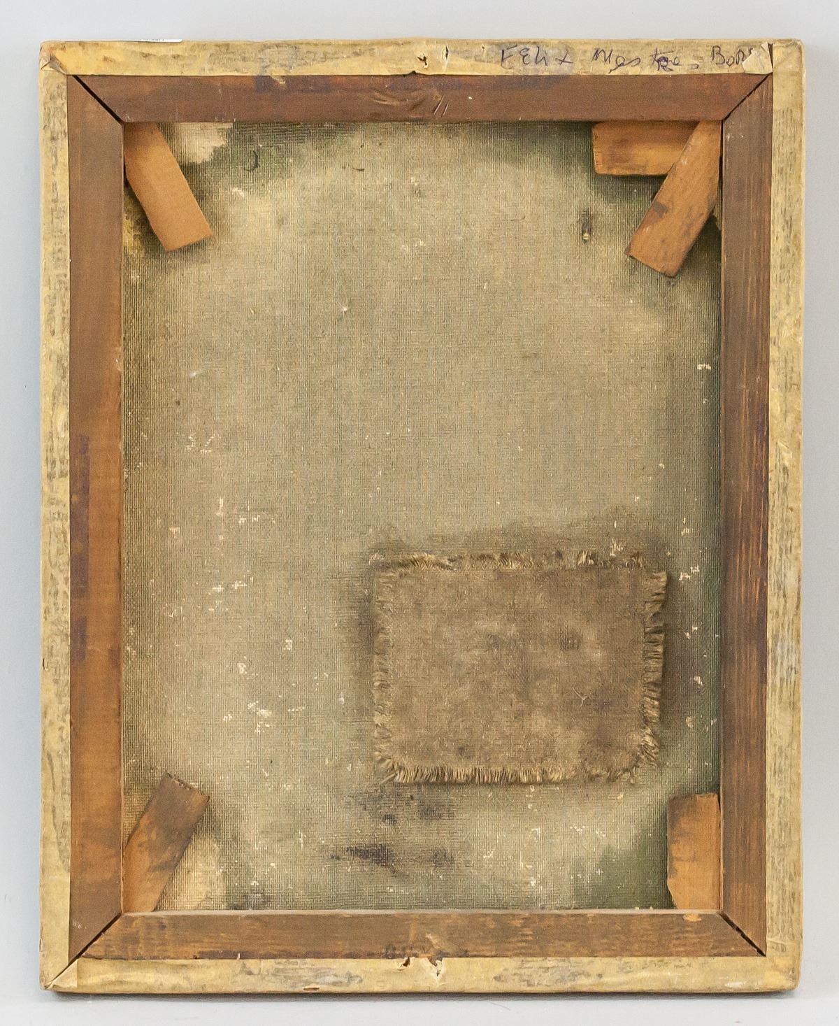 Oil on canvas, on stretcher bar. Featuring a landscape scene with two figures. Signed Felix Mestres Borrel on the lower left corner. Repair evident on verso. Inscribed on upper right corner of stretcher bar on verso, "Felix Mestres Borrel". Attributed to Felix Mestres Borrel (1872-1933, Spanish). Canvas: 30 x 24 cm (11.75 x 9.5 inches). Provenance: This lot carries limited provenance from a Southern Ontario estate
