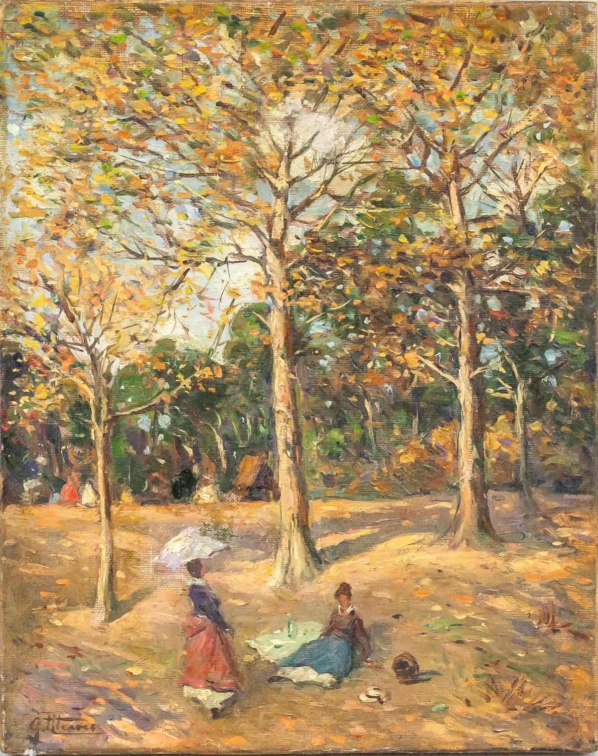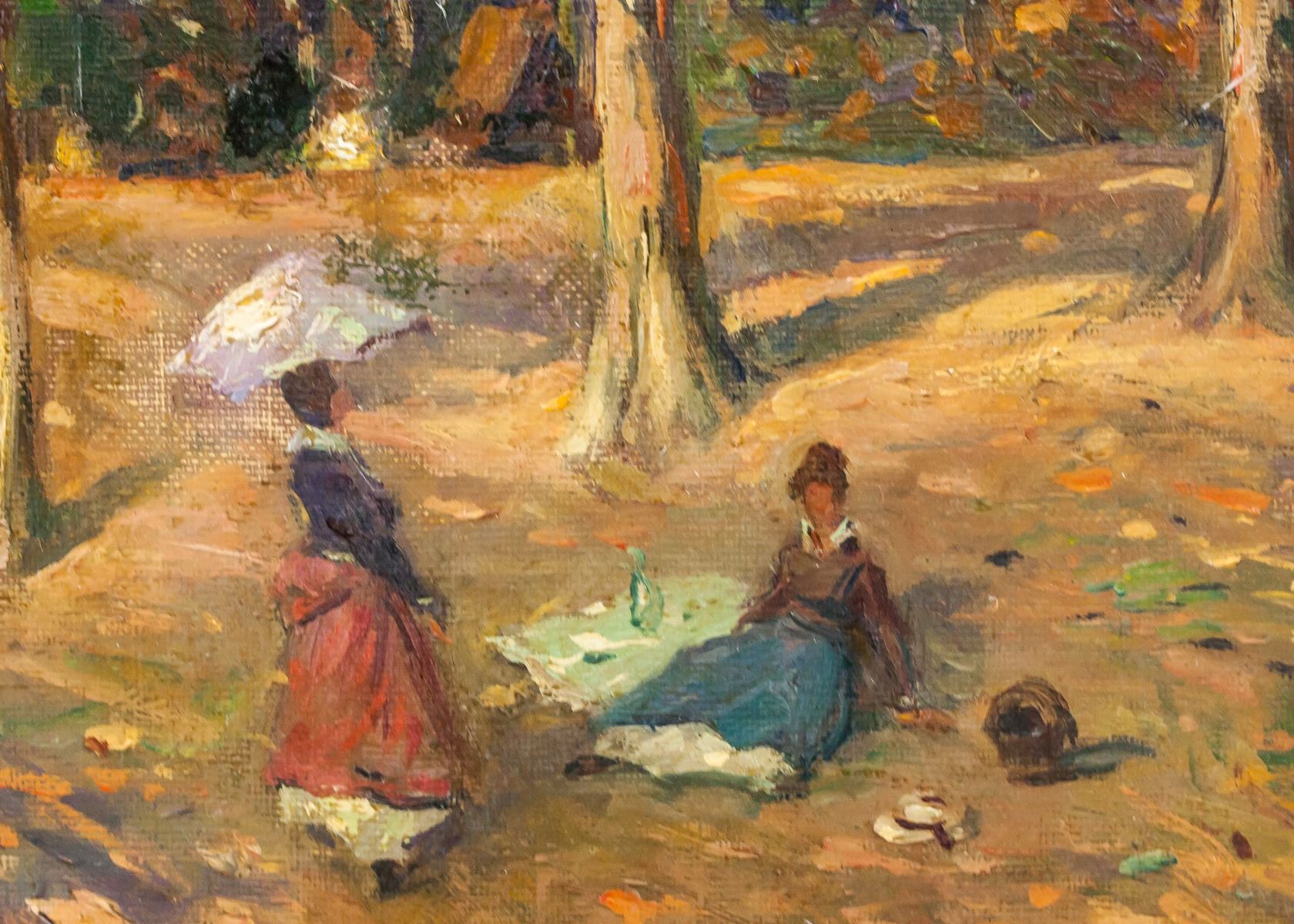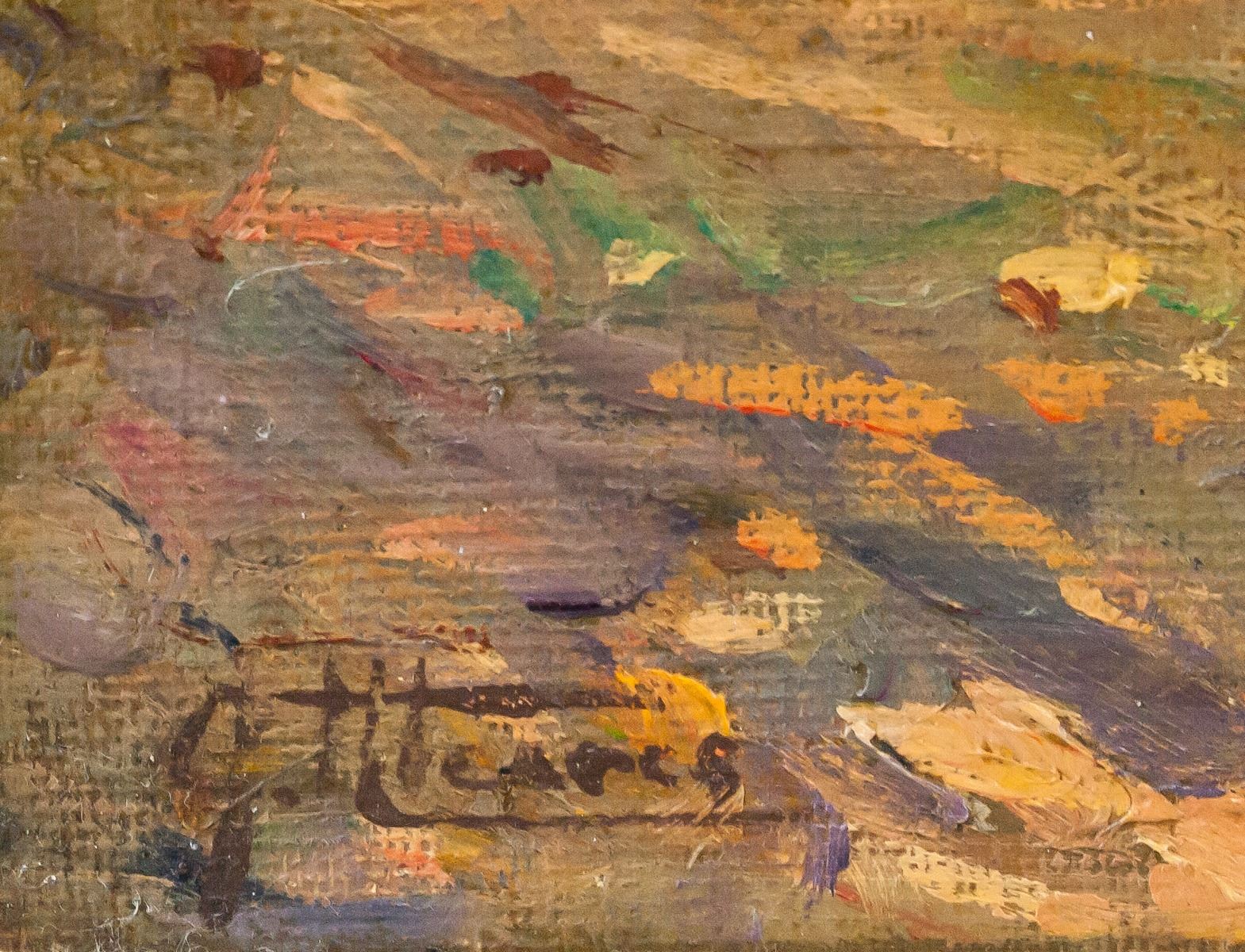Oil on canvas, on stretcher bar. Featuring a landscape scene with two figures. Signed Felix Mestres Borrel on the lower left corner. Repair evident on verso. Inscribed on upper right corner of stretcher bar on verso, "Felix Mestres Borrel". Attributed to Felix Mestres Borrel (1872-1933, Spanish). Canvas: 30 x 24 cm (11.75 x 9.5 inches). Provenance: This lot carries limited provenance from a Southern Ontario estate
