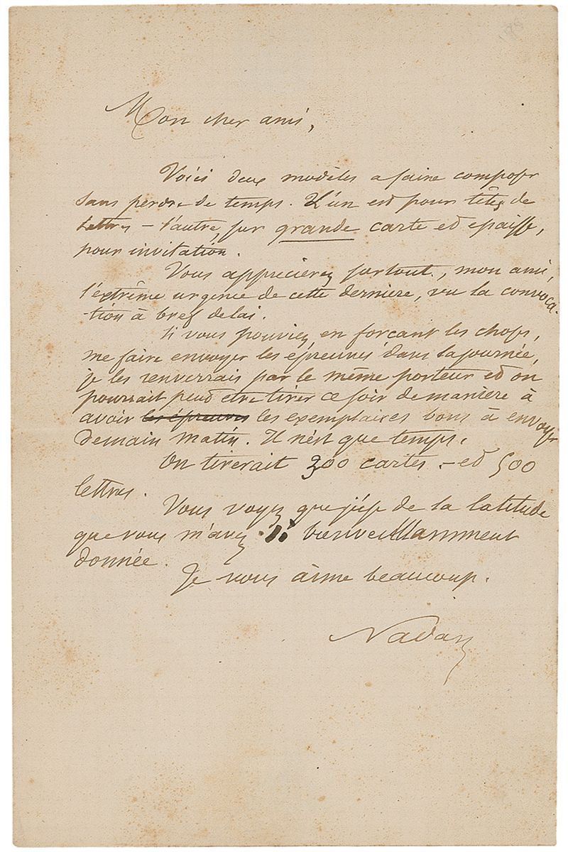 Pseudonym of Gaspard-Félix Tournachon (1820–1910), a French photographer, caricaturist, journalist, novelist, and balloonist. ALS in French, signed “Nadar,” one lightly-lined page of graph-like paper, 5.25 x 8, no date. Letter to a friend, from whom Nadar orders 300 engraved cards and 500 letterheads that he needs very urgently. He requests proofs to approve immediately. (The cards with his name and mark may have been used as a backing for his photographs). In very good condition, with scattered toning and soiling.