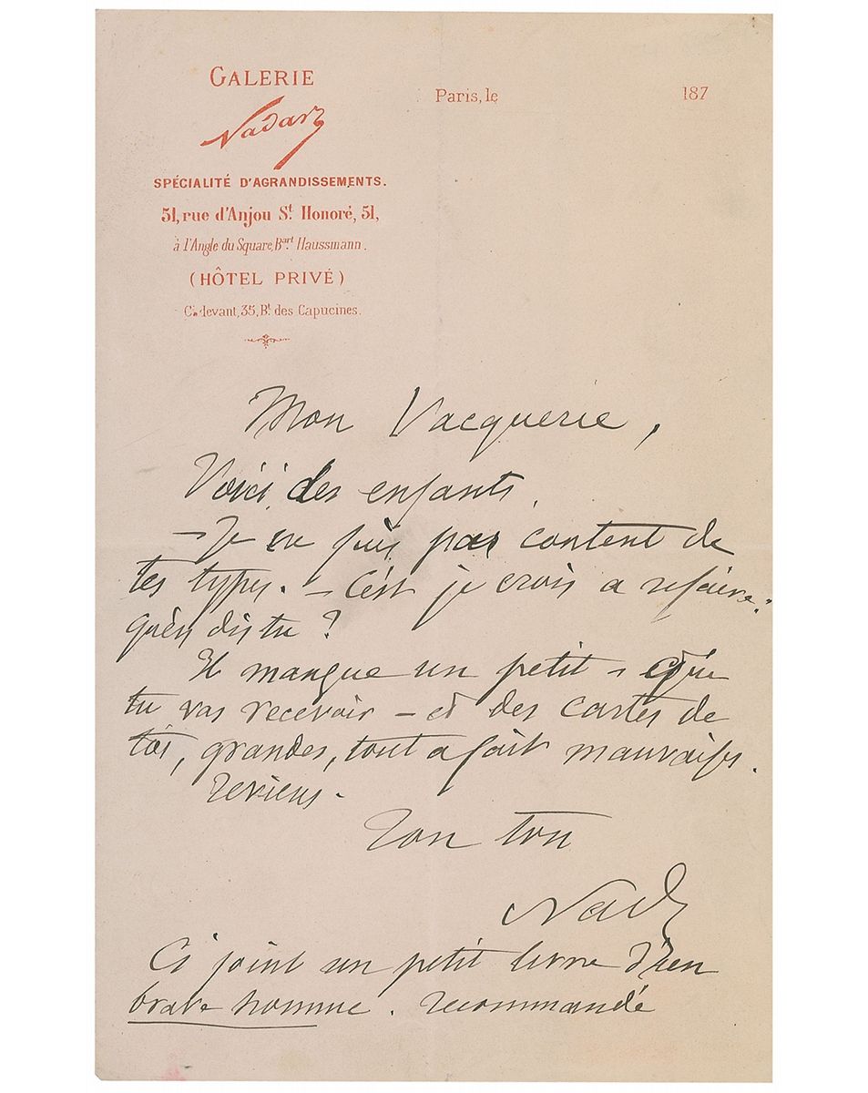Pseudonym of Gaspard-Felix Tournachon (1820–1910), a French photographer, caricaturist, journalist, novelist, and balloonist. ALS in French, signed “Nadar,” one page, 5.25 x 8.5, personal letterhead, circa 1870s. Letter in French to Auguste Vacquerie. In part (translated): “I am not pleased with your proofs I believe they should be done over.” Central vertical and horizontal folds and overall creases, otherwise fine condition.