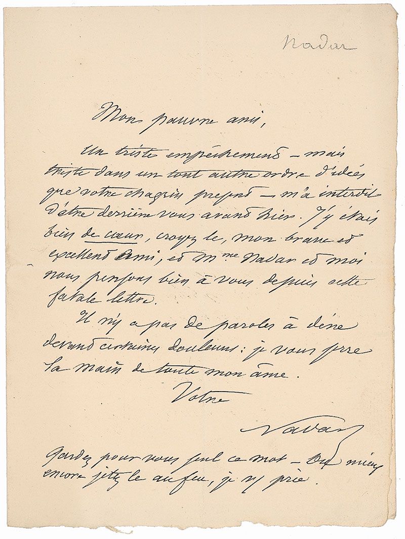 Pseudonym of Gaspard-Felix Tournachon (1820–1910), a French photographer, caricaturist, journalist, novelist, and balloonist. ALS in French, signed “Nadar,” one page, 5.25 x 7, no date. Untranslated letter to a friend. In fine condition, with central vertical and horizontal folds.