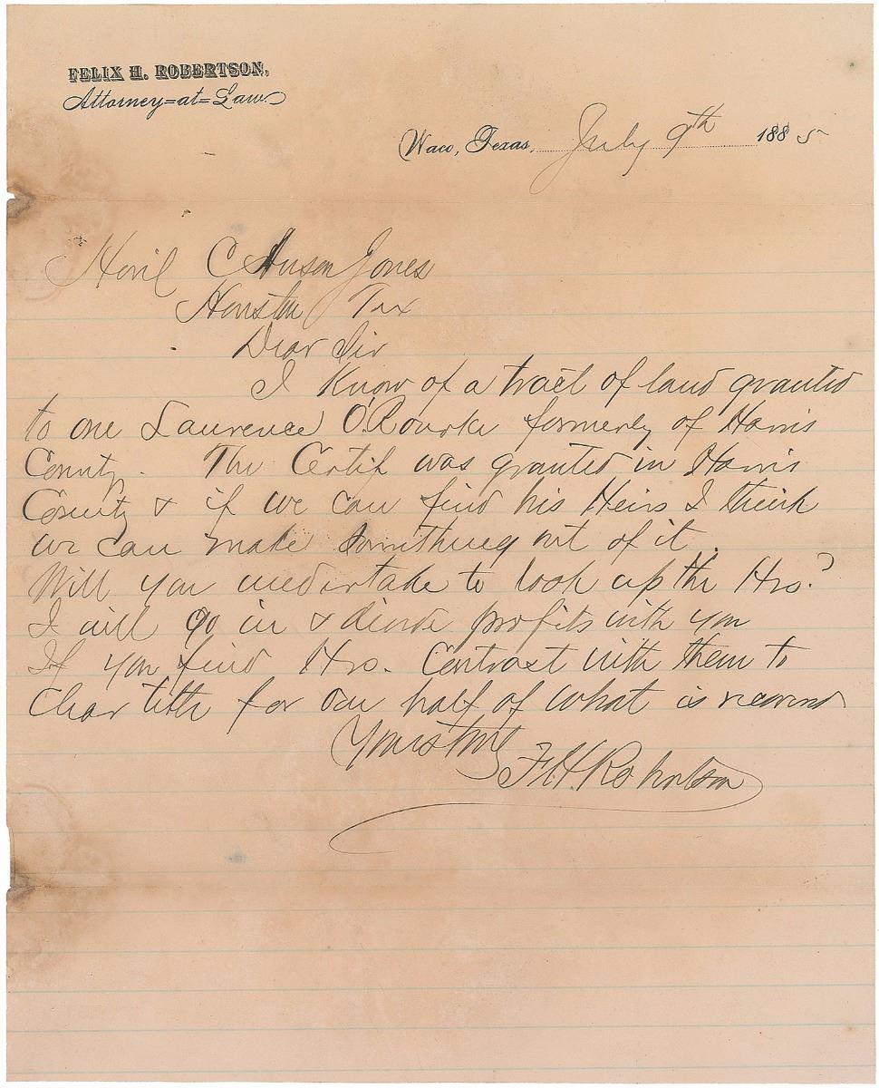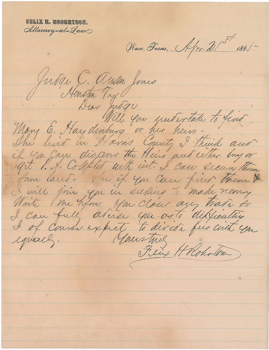 Two ALSs signed “Felix H. Robertson,” both one page, approximately 8.5 x 10.75, personal letterhead, April 21 and July 9, 1885. Both are directed to Judge C. Anson Jones. The first, in part: “Will you undertake to find Mary E. Haydenburg or her heirs…if you can find them I will join you in seeking to make necessary. Write me before you close any trade.” Second, in part: “I know of a tract of land granted to one Laurence O’Rourke formerly of Harris County. The Certif was granted in Harris County & if we can find his heirs I think we can make something out of it…I will go in and divide profits with you.” Scattered toning, small edge tears, and intersecting folds (one vertical fold passing through a single letter of the last name) and slight paper loss and water damage to left edge of the July letter, otherwise overall fine condition. Provenance: The Robert Davis Collection.
