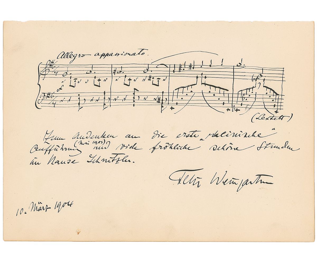 Austrian composer and conductor (1863–1942). Fantastic AMQS on an off-white 10 x 7 album page. Weingartner pens four detailed bars of an unidentified work for piano, inscribing under the quote, “in memory of the first ‘Rhenish’ performance (Mai 1903) and many happy hours in the beautiful home Schnitzler, Felix Weingartner, 10. Marz 1904.” The recipient, Victor C. Eduard Schnitzler, was a Cologne lawyer and patron. The Lower Rhenish Music Festival was one of the most important festivals of classical music, which happened every year with few exceptions between 1818 and 1958. In fine condition.