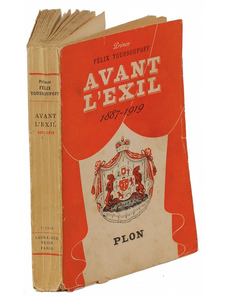 Russian prince and count (1887–1967) best known for participating in the assassination of Grigori Rasputin. Signed book: Avant L’Exil. Paris: Librairie Plon, 1952. Softcover, 5.5 x 8, 306 pages. Inscribed on the half-title page, in French, and signed “Youssoupoff, Paris 1952.” Autographic condition: uniform toning to page, and a few edge chips, otherwise fine condition. Book condition: G+/None.