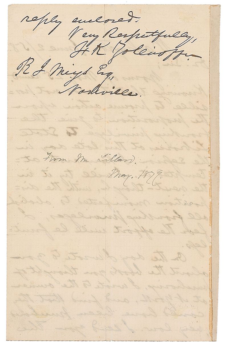 Confederate brigadier general (1812–1862) who was killed in action at the Battle of Mill Springs, making him the first Confederate general to die in the Western Theater. ALS signed “F. K. Zollicoffer,” one page both sides, 5 x 8, June 2, 1858. Letter to R. J. Meigs, Esquire, written while serving as a US Congressman from Tennessee. In part: “Knowing that it was not possible to procure action upon the proposition to give the franking privilege to State Libraries at this late day in the session, I have not attempted it. I will try it in the next – though, with the disposition manifested to abolish all franking privileges, I fear the effort will be fruitless.” Intersecting folds, some scattered toning, thin mounting strip along left edge, and a previous owner’s name in pencil on blank area of the reverse, otherwise fine condition.