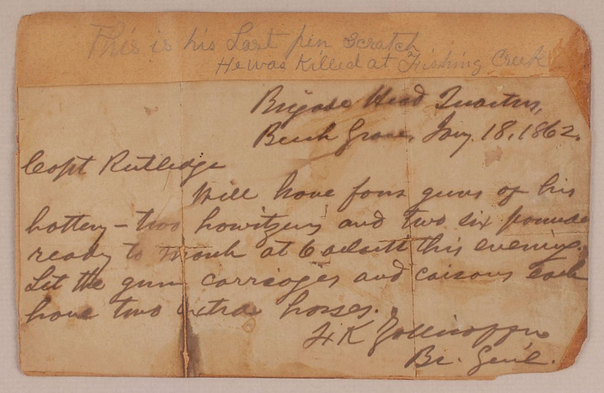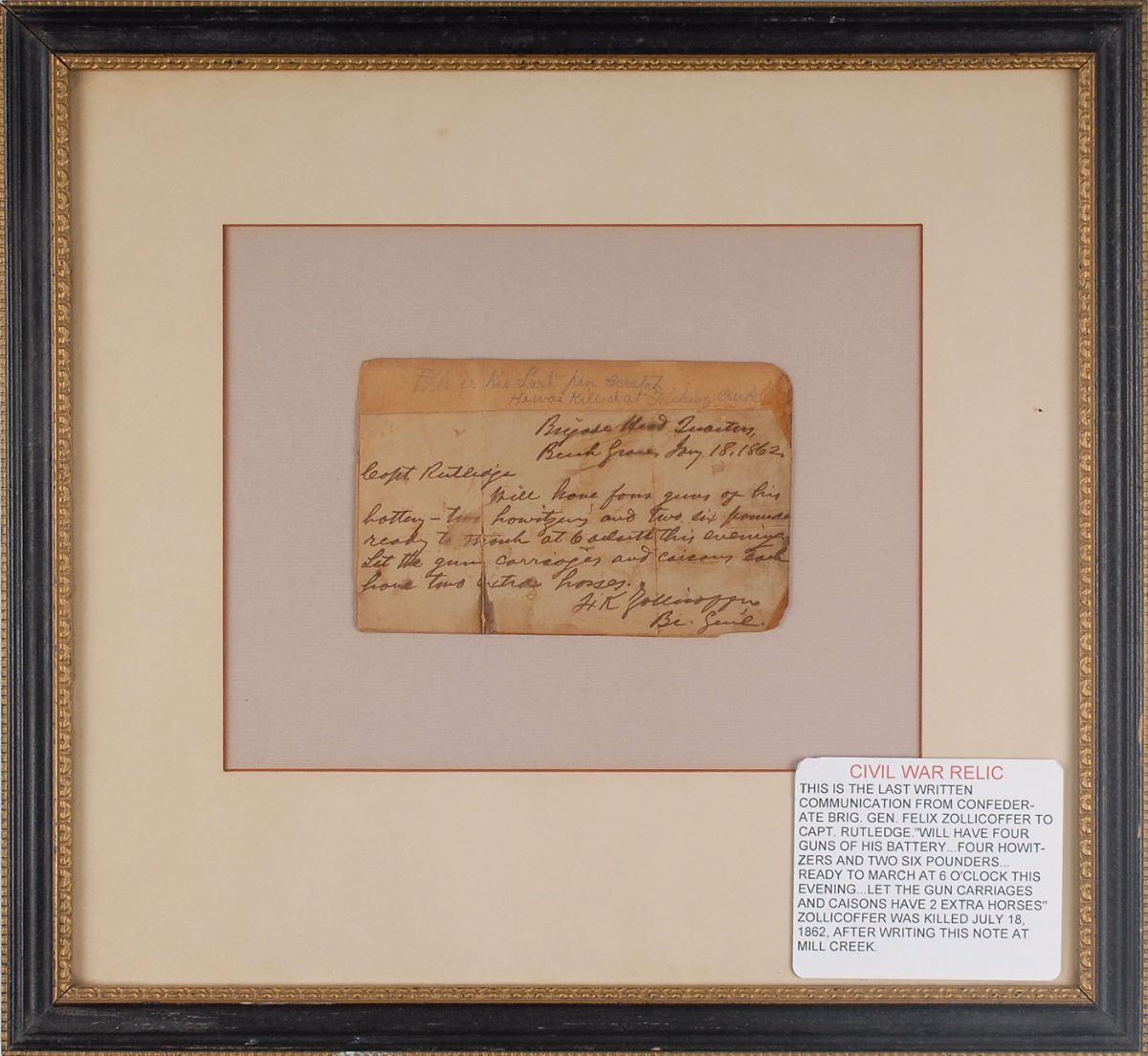 Confederate brigadier general (1812–1862) who was killed in action at the Battle of Mill Springs, making him the first Confederate general to die in the Western Theater. ALS signed “F. K. Zollicoffer,” one page, 6.5 x 4, January 18, 1862. Field directive to Captain Rutledge issued from his headquarters at Beech Grove. In full: “Will have four guns of his batter—two howitzers and two six pounders ready to march at 6 oclock this evening. Let the gun carriages and caissons each have two extra horses.” Affixed to a slightly larger sheet for reinforcement. Mounted, matted, and framed to an overall size of 17 x 16. Complete separations to intersecting folds (one vertical fold passing through a single letter of the signature), heavy soiling and some dampstaining, and brushing to ink, otherwise very good condition. This letter dates to one day before the Battle of Mill Springs, in which Zollicoffer was killed in action; a collector’s pencil notation identifies it as his last letter.