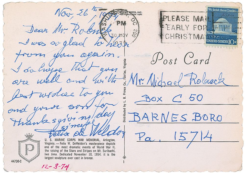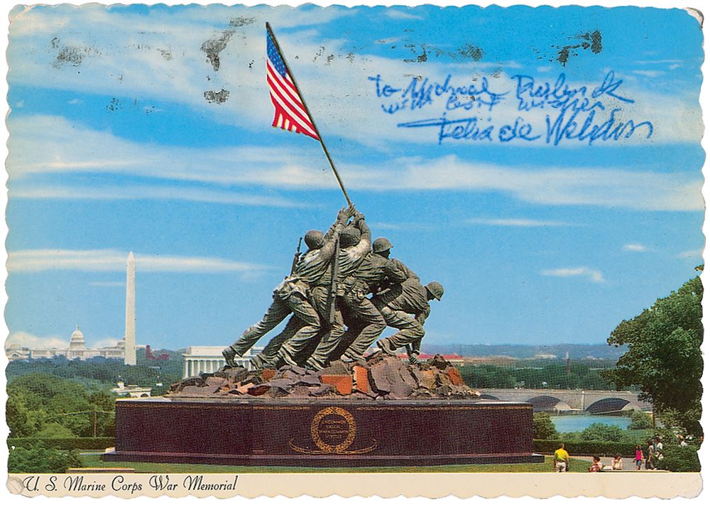 Austrian-American sculptor (1907–2003) famous for his USMC War Memorial of the flag raising at Iwo Jima. Color 5.75 x 4 deckle-edge postcard of de Weldon’s U S Marine Corps War Memorial, signed and inscribed on the front in blue ballpoint “To Michael Robuck, with best wishes, Felix de Weldon.” Also contains an ALS from de Weldon on the reverse, thanking Mr. Robuck for his letter. In fine condition, with light soiling along the top and some spreading to the signature and inscription on the front.