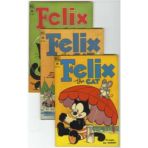 Despite the "Pat Sullivan" name above the title, make no mistake -- these wonderful comics were the work of artist/writer Otto Messmer. Included are issues #11 (VG), #13 (VF), #15 (VF-), #16 (VF+), #18 (2 copies, one in VG+, the other VF+), #19 (last Golden Age Dell issue - VF+), #25 (FN), #33 (GD/VG), #34 (GD/VG), #35 (VF-), #43 (VG/FN), and #44 (FN). Approximate Overstreet value of group = $675. <I>From the Crippen Collection.</B></I><BR><BR><b>Shipping:</b> Un-Slabbed Comic (<a target="_blank" href="http://www.heritageauctions.com/common/shipping.php">view shipping information</a>)