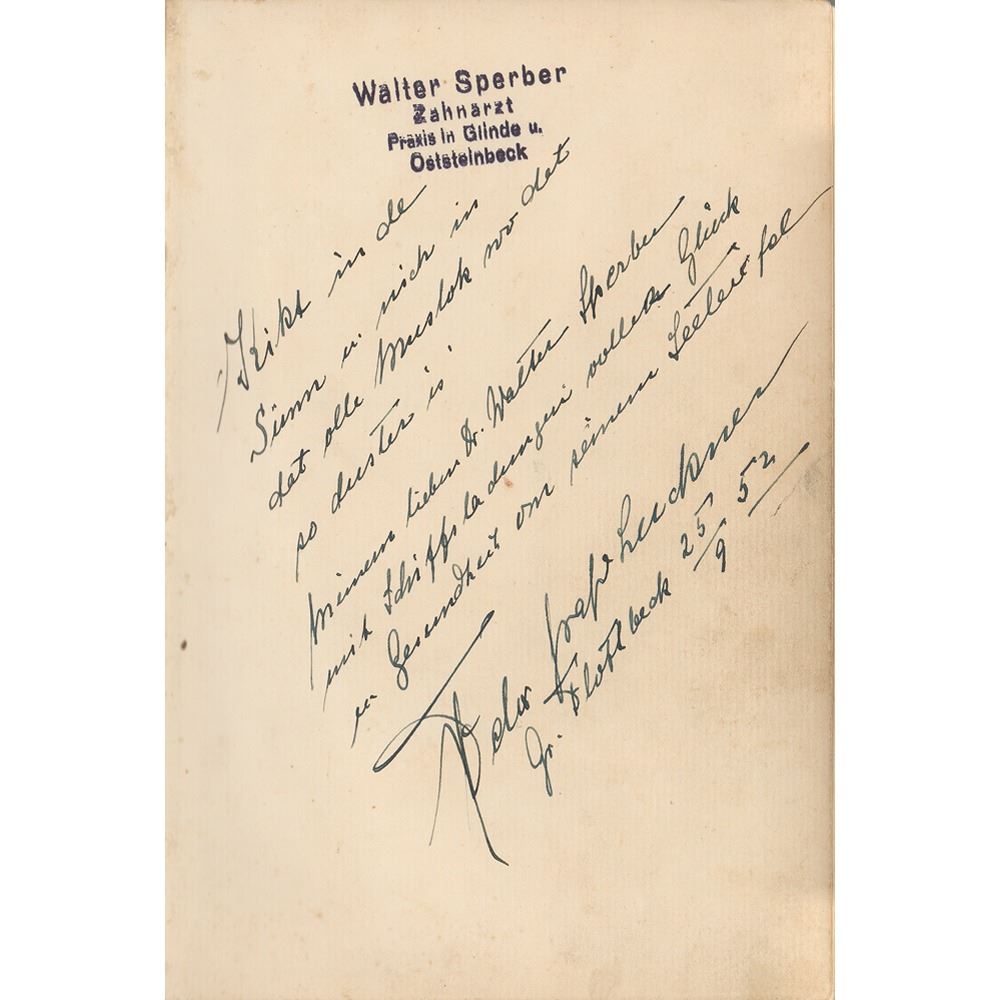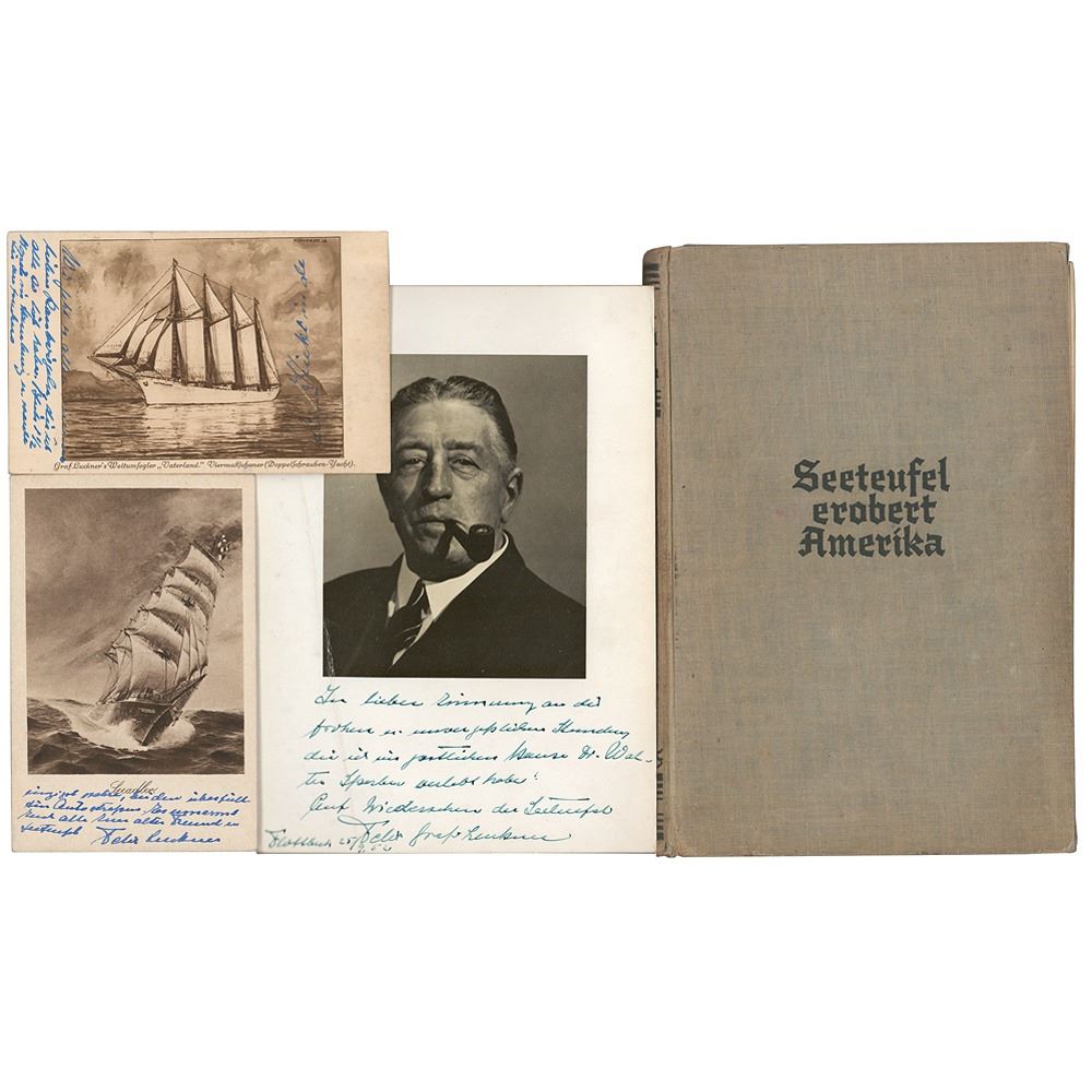 German naval officer (1881–1966) who earned the nickname ‘Sea Devil’ for his legendary maritime exploits during World War I. Four items signed by Luckner: a hardcover German edition of Seeteufel Erobert Amerika, lengthily signed and inscribed on the first free end page in fountain pen, and dated 1952; two postcards depicting ships, one signed on the front by Luckner with an untranslated autograph note on the reverse, and the other annotated on the front by Luckner, with a typed note signed on the reverse; and a matte-finish 5.75 x 8.25 portrait, signed and inscribed in the wide margin in fountain pen by Luckner. In very good to fine condition, with a cracked hinge to the signed book, and a heavy diagonal crease to the signed photo.