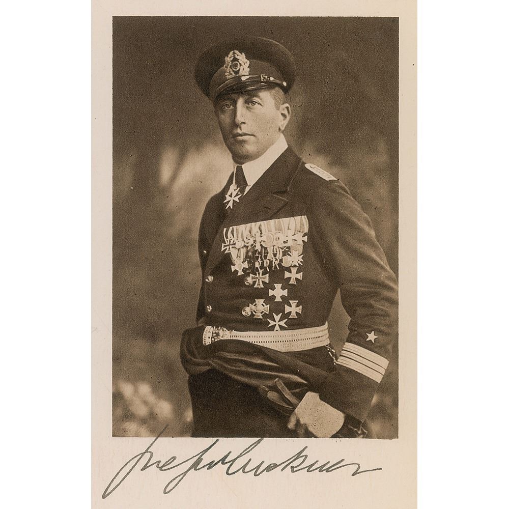 German naval officer (1881–1966) who earned the nickname ‘Sea Devil’ for his legendary maritime exploits during World War I. Striking 3.5 x 5.5 postcard photo of Felix von Luckner in his impressively decorated military uniform, signed in the lower border in black ink. In very fine condition.