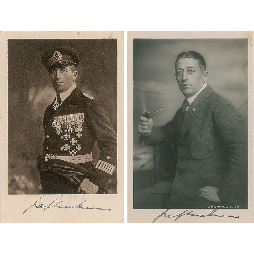 Two different matte-finish 3.5 x 5.5 postcard photos, each signed in the lower border in fountain pen by Luckner. In very good to fine condition, with light scratching to the uniformed pose, and light silvering to the casual pose.