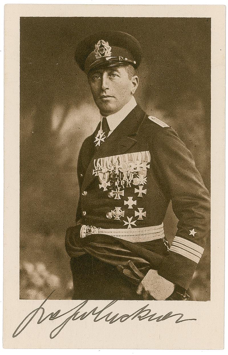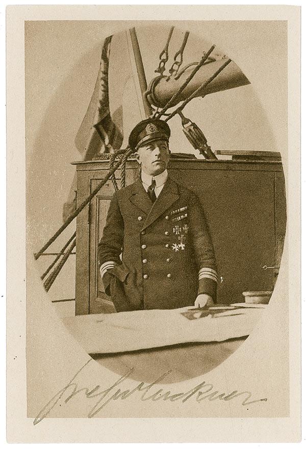 Famed German naval officer (1881–1966) who earned the nickname ‘Sea Devil’ for his legendary maritime exploits. Two different 3.5 x 5.5 vintage postcard portraits of von Luckner in uniform, signed in fountain pen. In fine condition with a central horizontal scratch across one image.