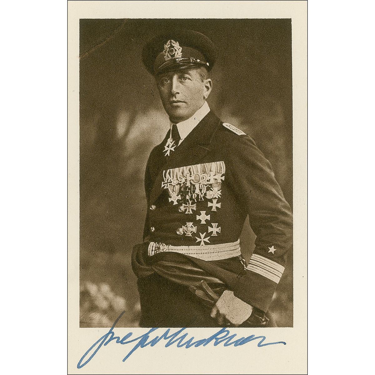 Famed German naval officer (1881–1966) who earned the nickname ‘Sea Devil’ for his legendary maritime exploits. Two identical 3.5 x 5.5 vintage postcard portraits of von Luckner in uniform, signed in the bottom border in fountain pen. In fine condition.