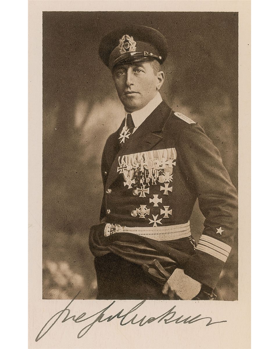 German naval officer (1881–1966) who earned the nickname ‘Sea Devil’ for his legendary maritime exploits during World War I. A 3.5 x 5.5 postcard photo of von Luckner in his impressively decorated military uniform, signed in the lower border in black ink. In fine condition.