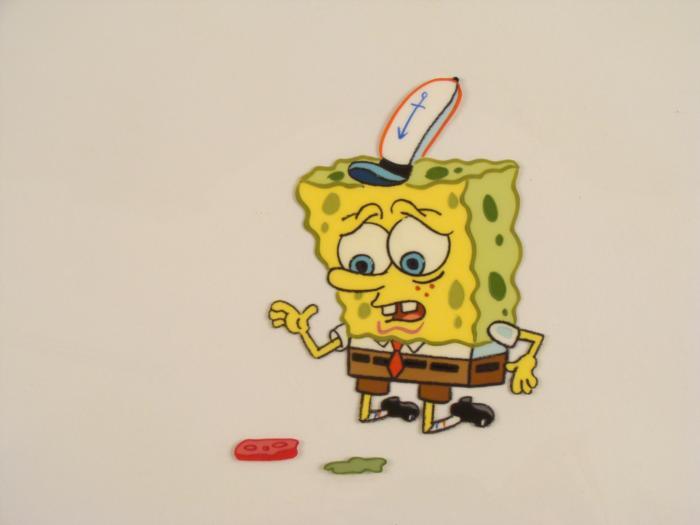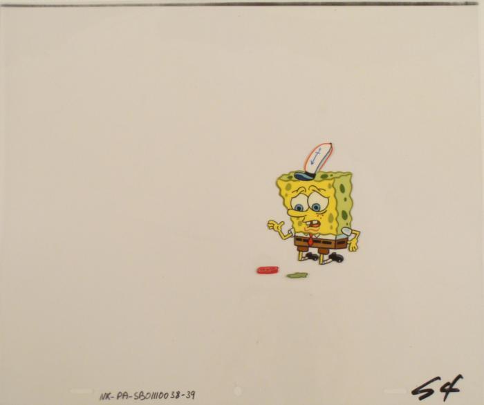 This original animation cel is from the Nickelodeon TV show SpongeBob Squarepants. The story takes place under the deep blue sea in Bikini Bottom, where SpongeBob resides. SpongeBob, who is a yellow, porous sponge, is your typical happy-go-lucky character, as he is always cheerful and enjoys making people laugh. Patrick Star, SpongeBob's neighbor who is a starfish, is your average children's show idiot, as he boasts knowing nothing and is often getting himself into ridiculous situations. Between the homes of these two lies the home of the miserable Squidward, a squid, who is known for being grouchy and playing tricks on SpongeBob and Patrick. Both SpongeBob and Squidward work at the Krusty Krab, a fast food business run by the greedy money-loving Mr. Krabs, a crab, the arch rival of the evil, possibly misunderstood, Plankton. Another neighbor, Sandy Cheeks, an athletic squirrel who normally wears an astronaut's space suit, was introduced in "Tea at the Treedome." She spends most of her time inventing and experimenting. SpongeBob is sad the lettuce and tomato is on the floor.Original Production Animated Cel Overall Size of Cel: 10 1/2" x 12 1/2" Very Good ConditionThis is an original hand-painted cel set-up used in the production of an episode of "SpongeBob SquarePants." Each one-of-a-kind set-up represents a slight change in position of the characters. When individually photographed and projected in rapid succession, the images appear to move.