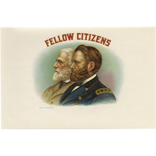 <B><I>Fellow Citizens</B></I></B></I> <B>U.S. Grant and Robert E. Lee Cigar Label by the Calvert Lith. Co. of Detroit.</B></I> A lithographed 9" x 6" inner label with distinguished bust portraits of the famous Civil War adversaries Grant and Lee both facing left. Calvert has done a nice job of embossing the generals' beards and hair. Labels like this one have wide appeal to Civil War collectors as well as to political and military memorabilia specialists. Excellent condition. This label is listed as one of the "InStone 100" blue chip cigar labels.<BR><BR><b>Shipping:</b> Small Flat (<a target="_blank" href="http://www.heritageauctions.com/common/shipping.php">view shipping information</a>)