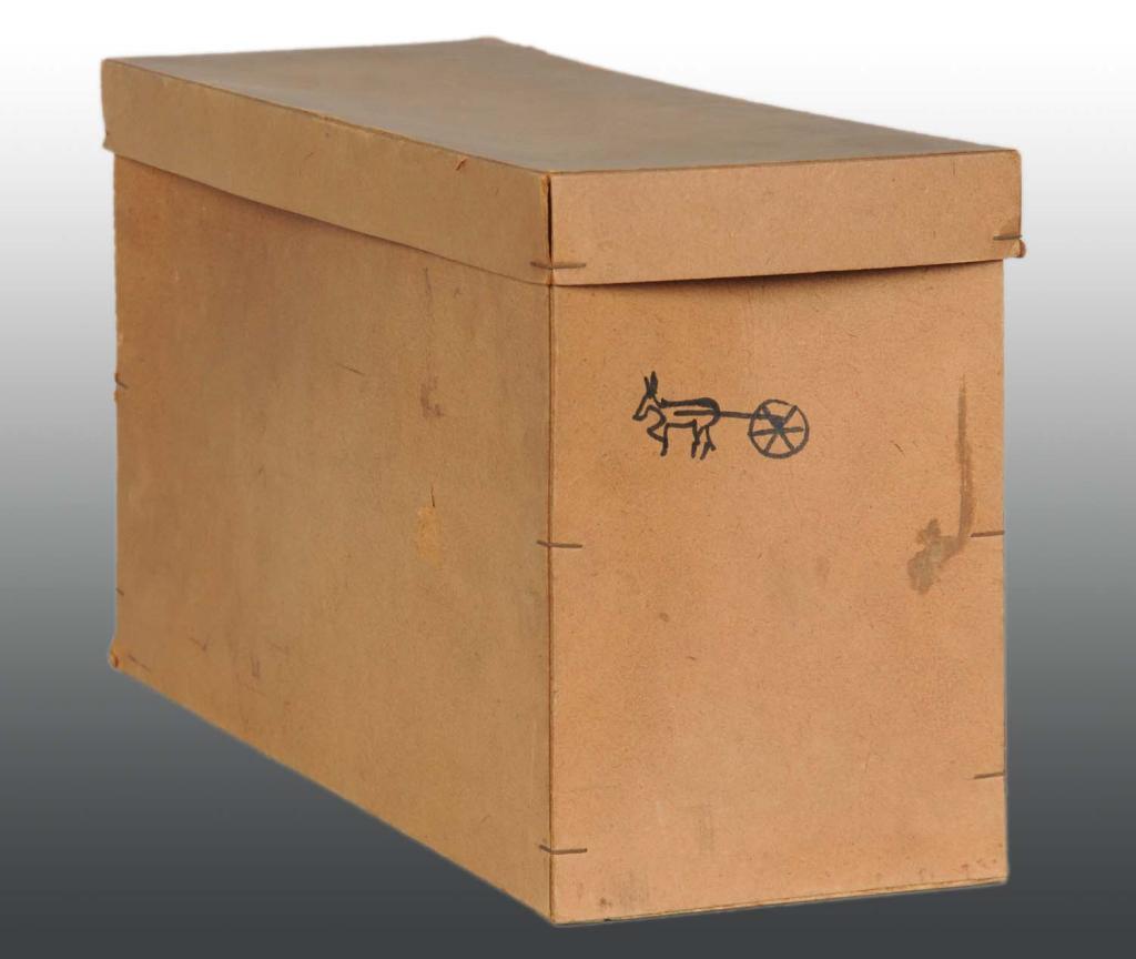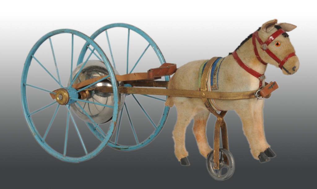 German. Wheels are metal. When pushed, bell rings. Some minor staining to donkey and moderate chipping and wear to wheels. Includes original box. Condition (Very Good). Size 12" L.