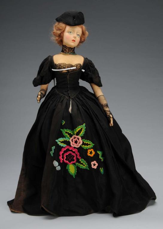 Italian, circa 1920s. Jointed felt doll with molded head. Lovely lady face with side-glancing gray/blue eyes, eye shadow, closed mouth with lip shading, rosy cheeks and light brown mohair wig. Wearing original black silk dress with appliqués, matching black felt tricorn hat, lace mitts, silk stockings, felt garter and black high-heeled shoes. Light fading on dress. Condition (Excellent). Size 30" T.
