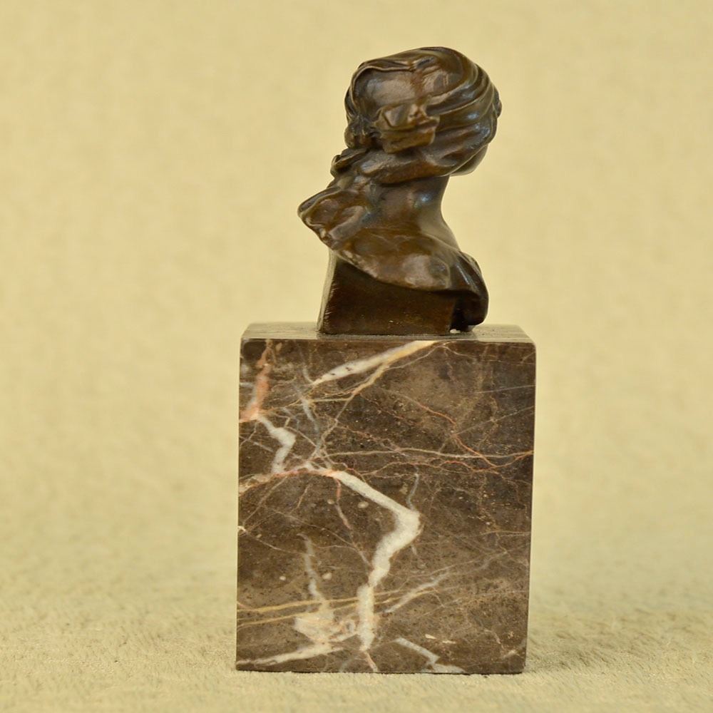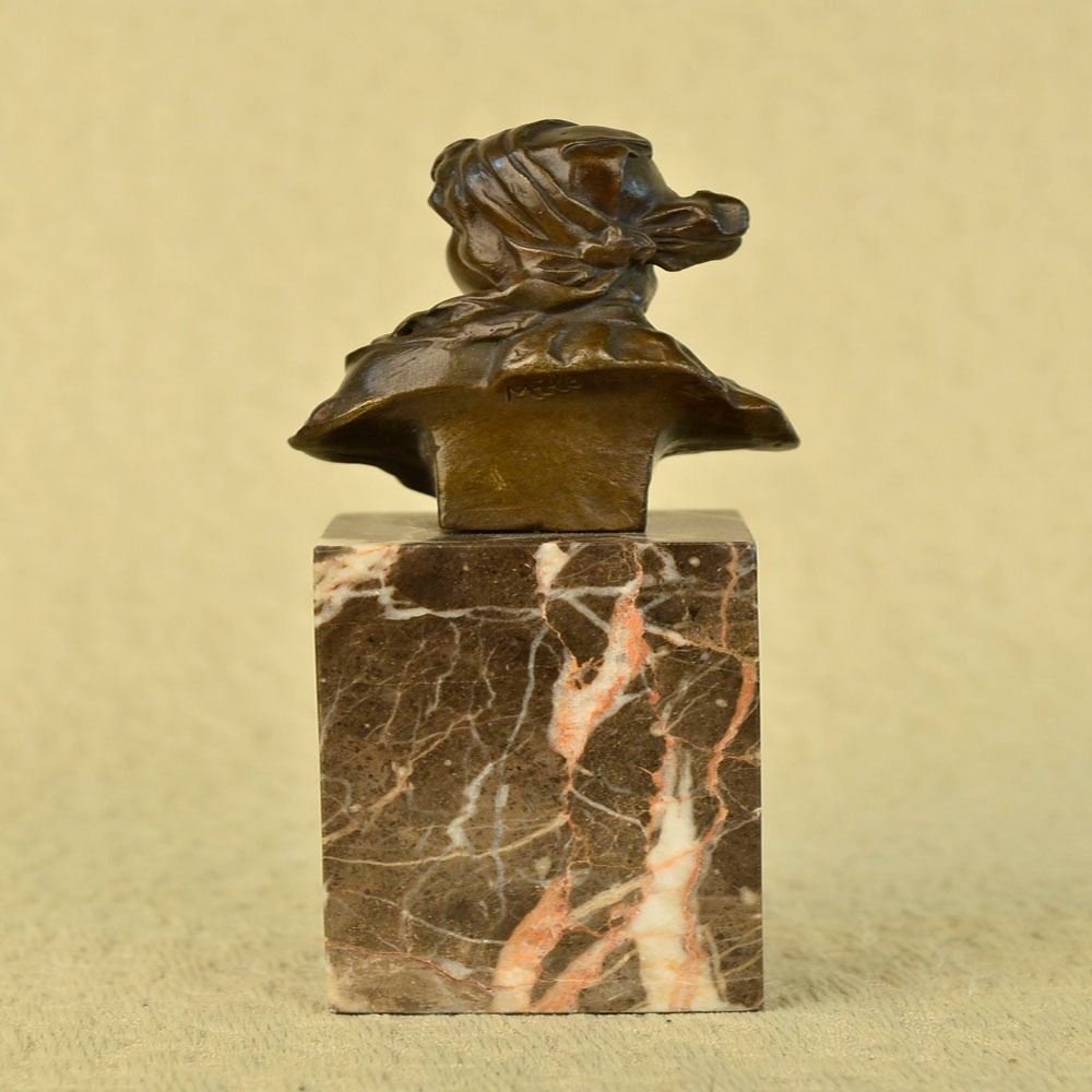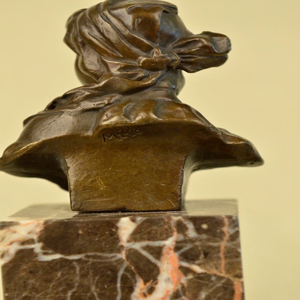This piece is a bust of a forlorn maiden crafted by the French artisan, Milo. The details of this piece have been crafted in an extraordinary way that allowed Debut to truly bring it to life. The girl rests her head to the side in deep thought, possibly thinking about her long lost love. She has her head wrapped in a manner that only allows a few strands of her hair escape, thus drawing more attention to the beauty of her face. We only catch a glimpse of the garment that she is wearing, but from off the shoulder shape of her bodice, one can deduce that her dress is just as gorgeous and flowing as the flowing lines created by the draping of her scarf, hair, and exposed neck. This is the epitome of what it means to find beauty in simplicity. Cast in Bronze, set atop a black marble base. Signed Milo. This piece is a musthave that will surely be treasured for years to come, featuring the lost wax method of casting, founded thousands of years ago ensuring an exquisitely detailed Sculpture that will add grace and beauty to your business or home. Bronze Dimensions with Marble Base: Height 9 x Width 3 Marble Dimensions: 3 X 3 Height without base: 4 Weight: 6 LBS. Inventory: 15XNBT0232651