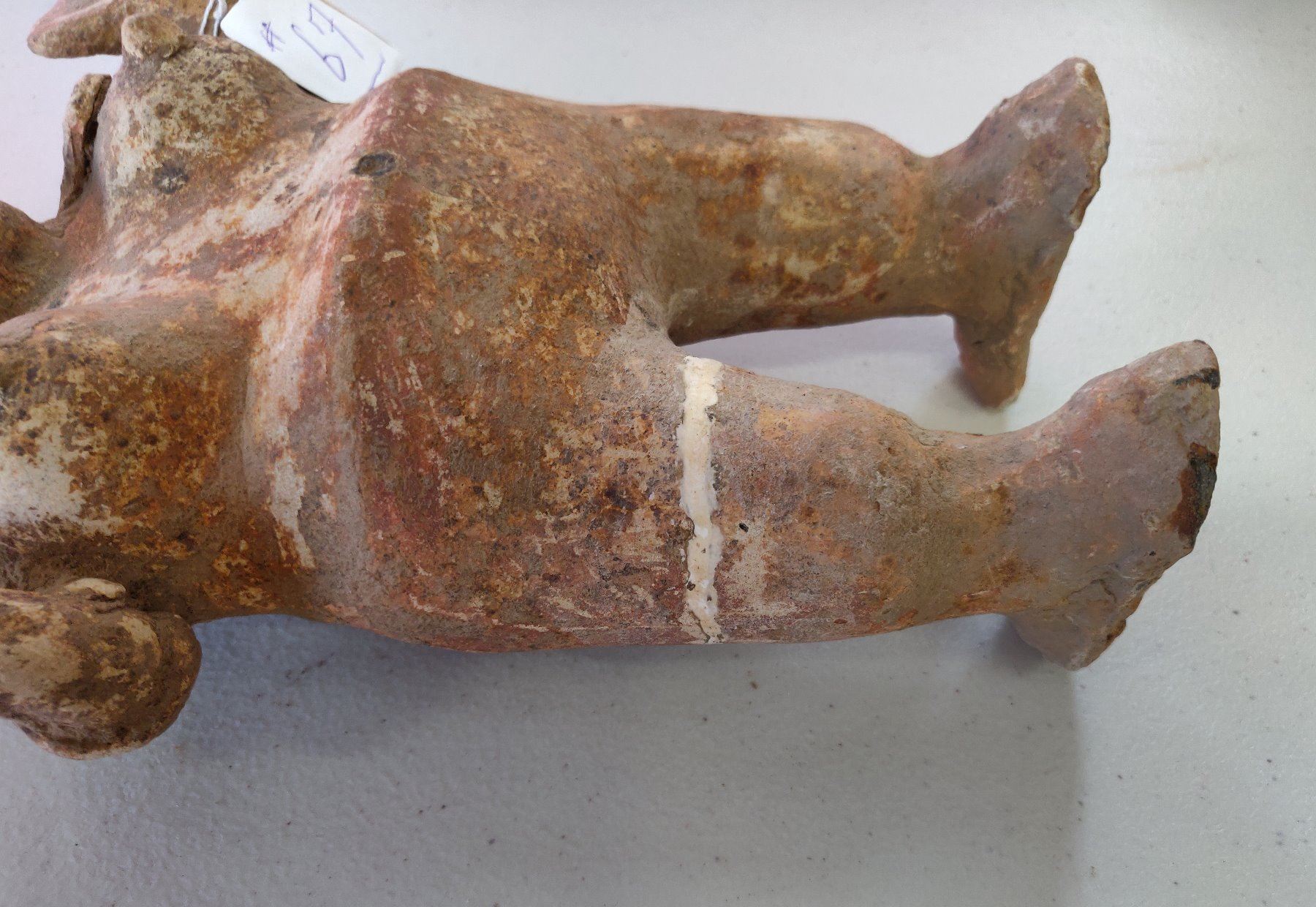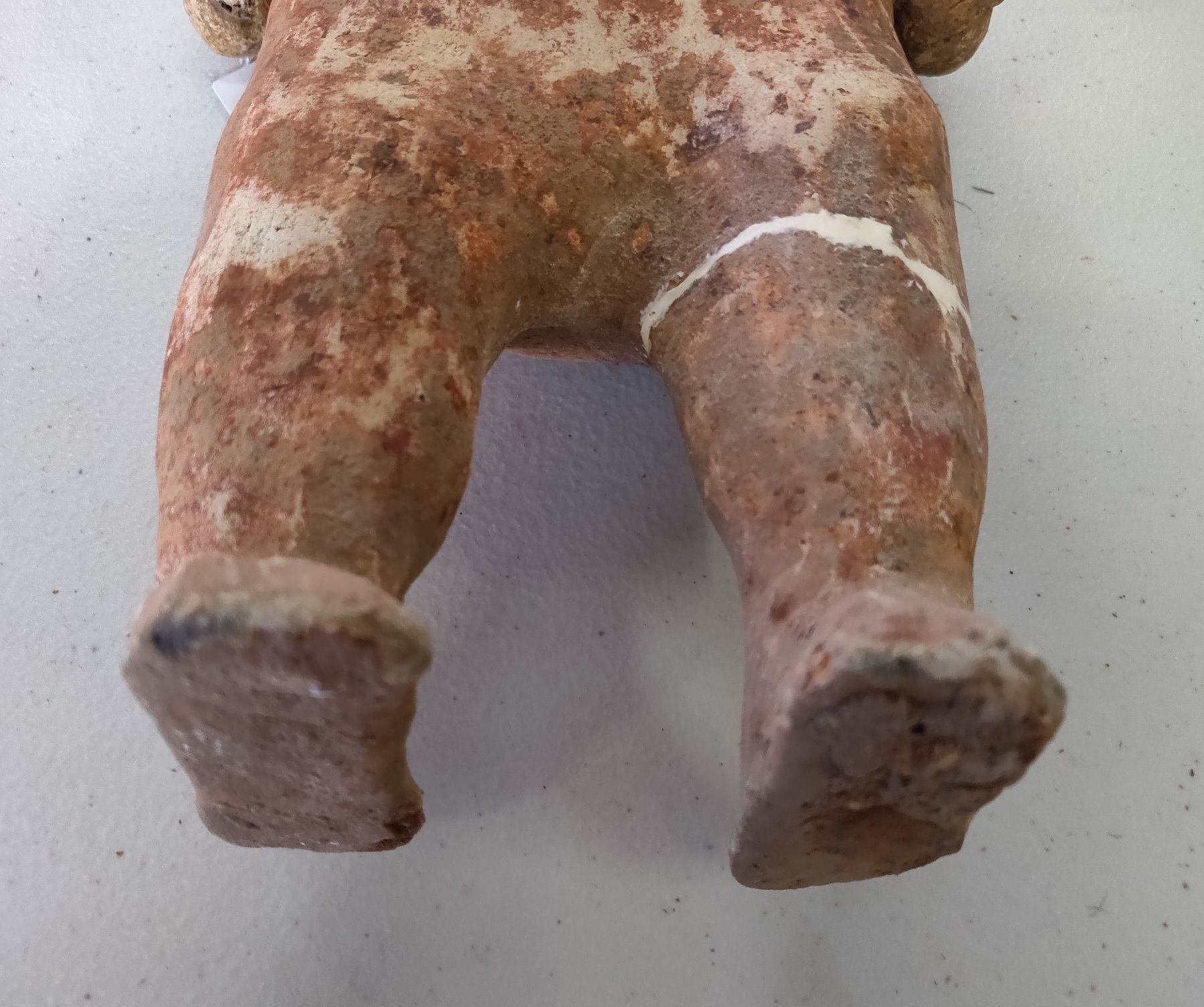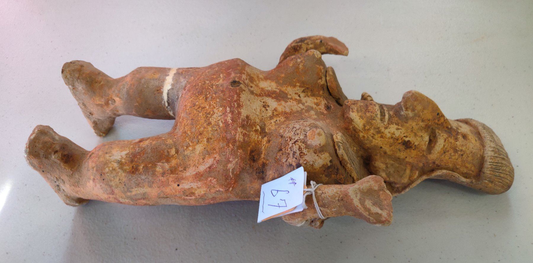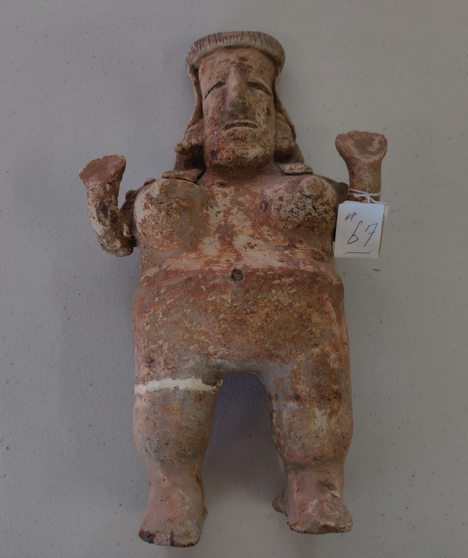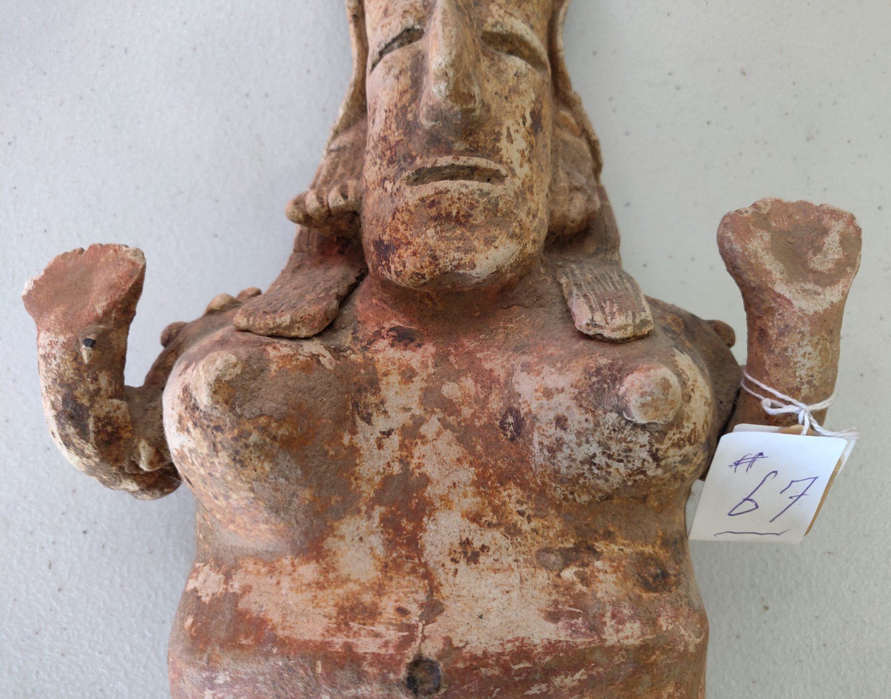 Female Clay Figure, pre-Columbian item. Made of clay, the item measures 22 1/2". Jalisco, Mexico. Condition: Chips and leg repair, see images. Shipping: $45.00 USA estimate only, w/insurance and signature.