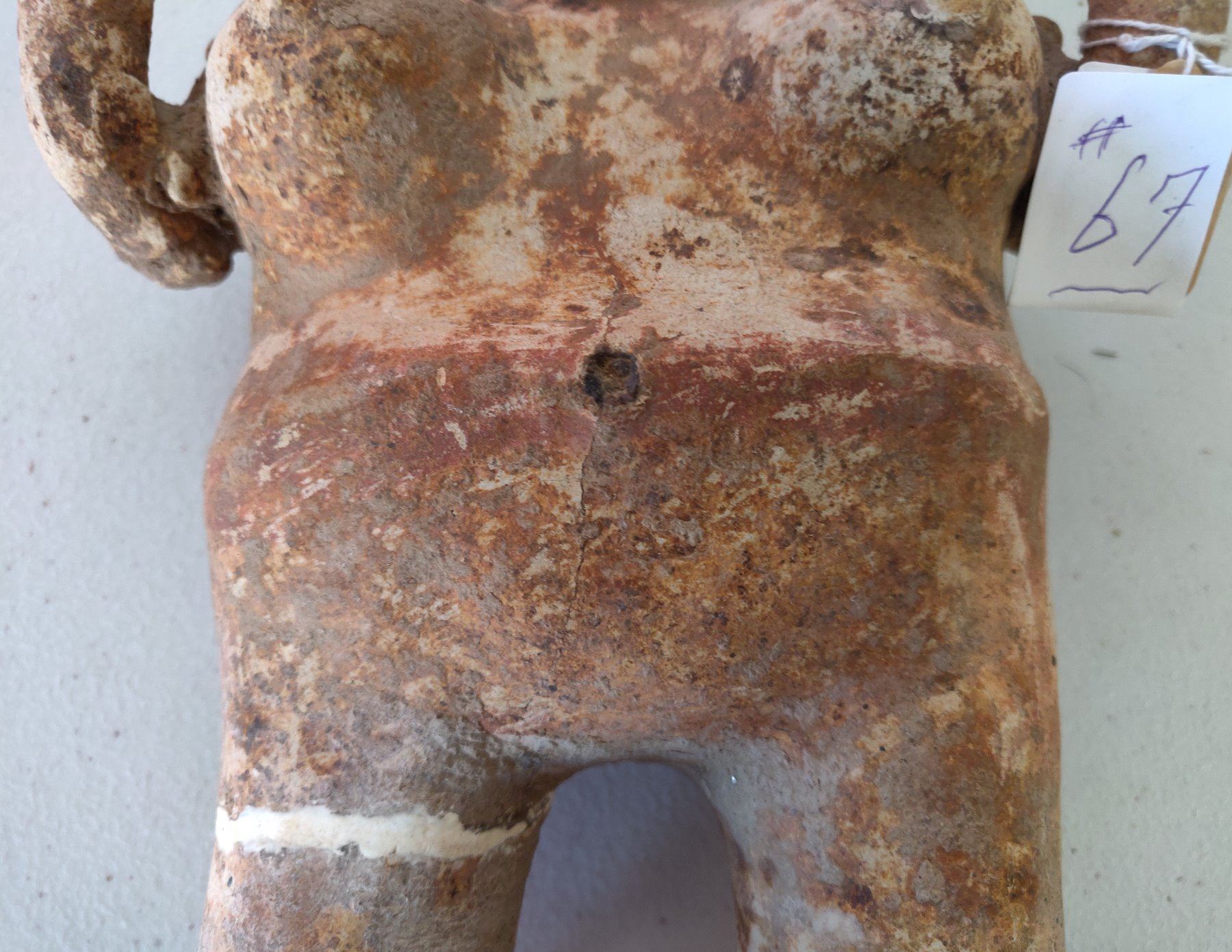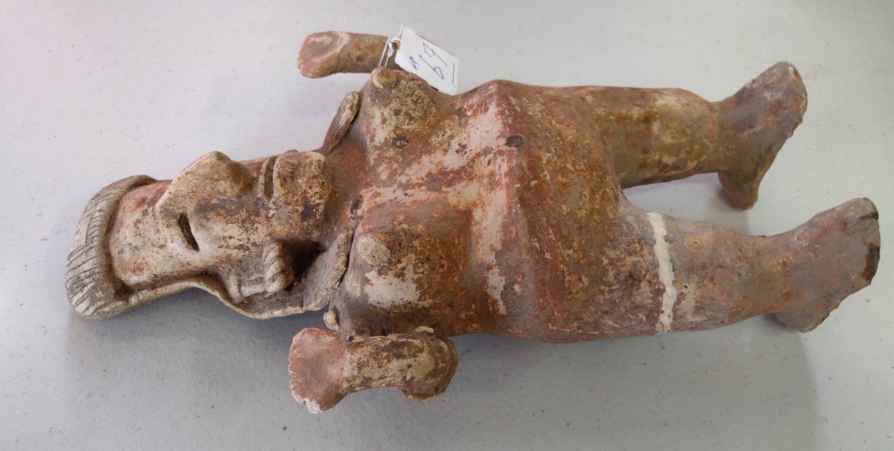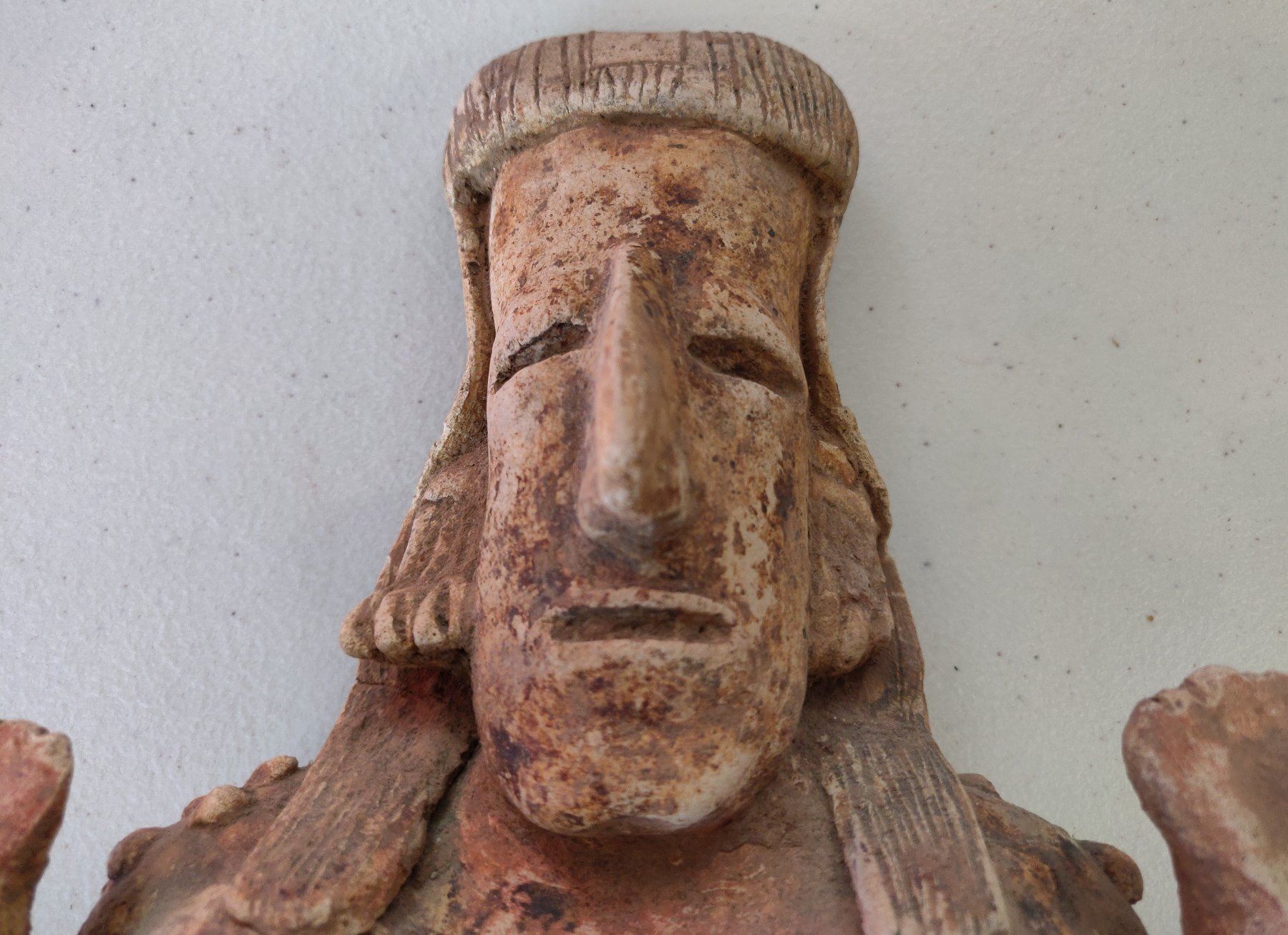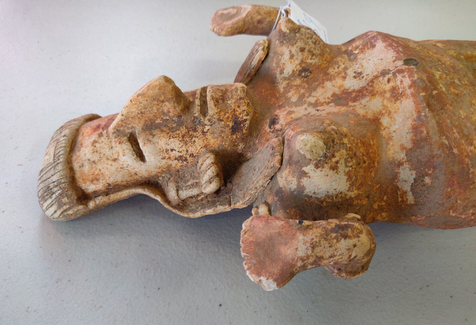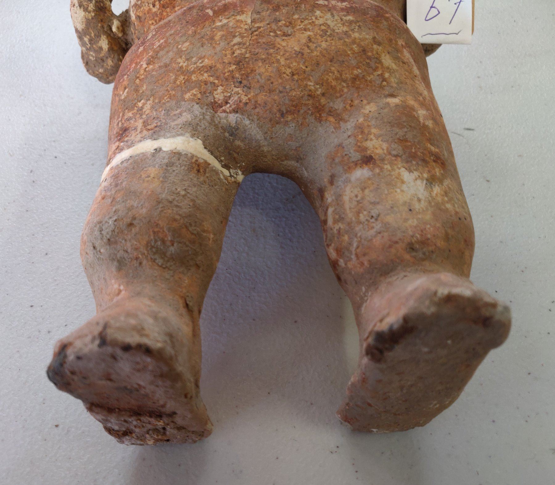 Female Clay Figure, pre-Columbian item. Made of clay, the item measures 22 1/2". Jalisco, Mexico. Condition: Chips and leg repair, see images. Shipping: $45.00 USA estimate only, w/insurance and signature.