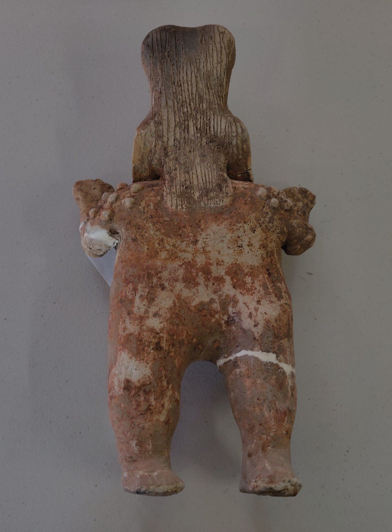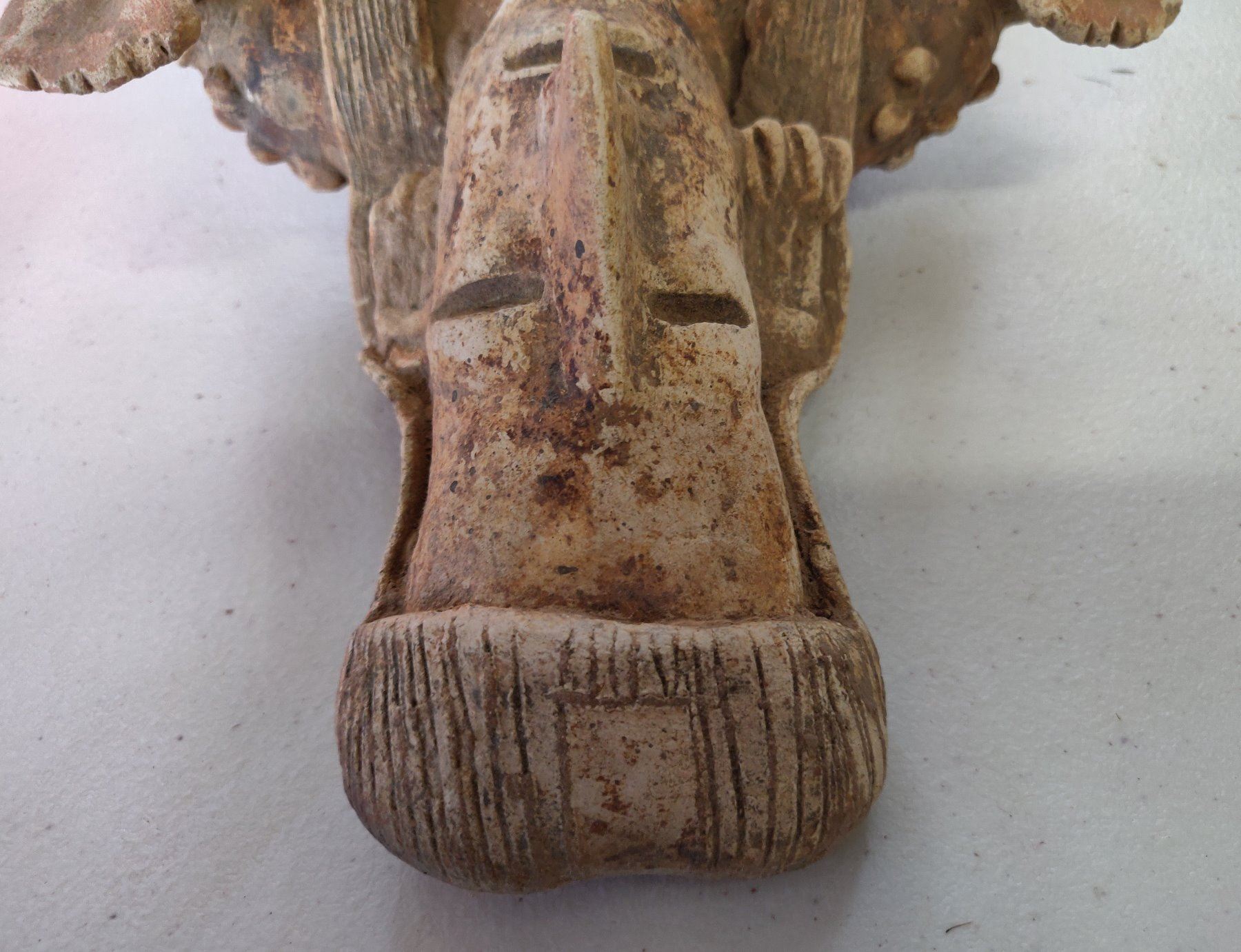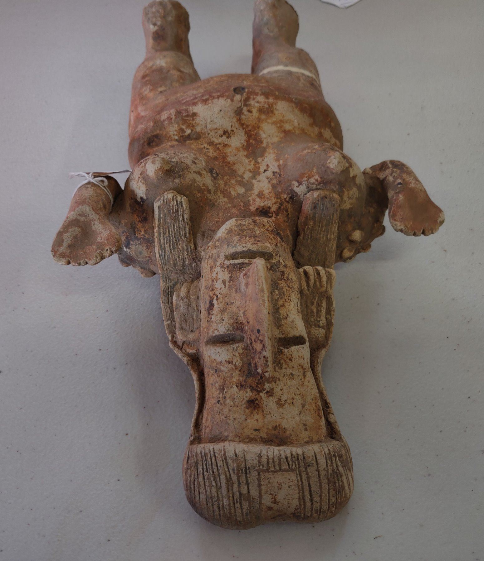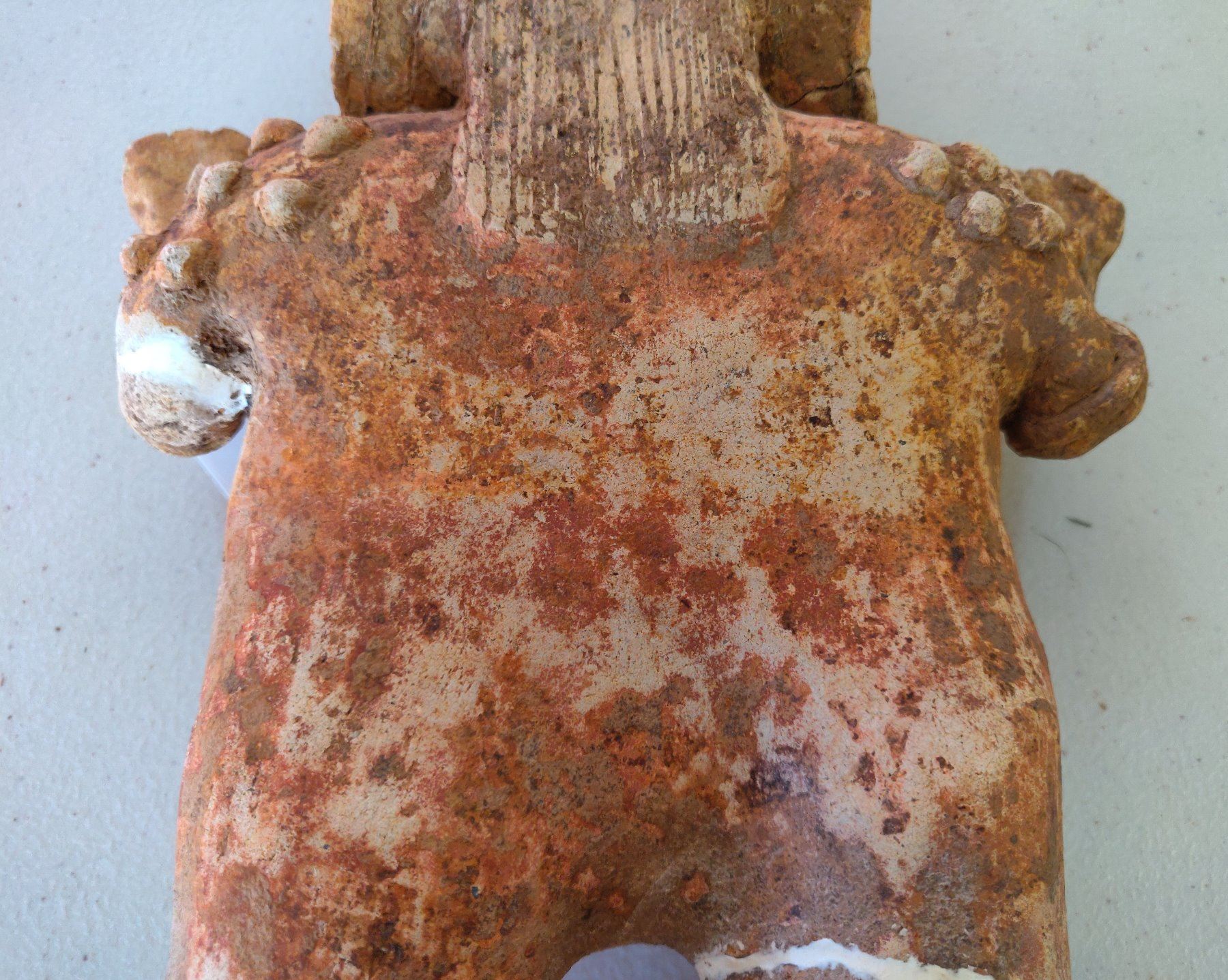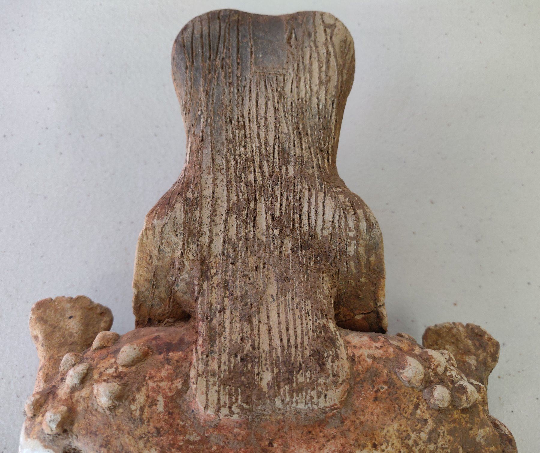 Female Clay Figure, pre-Columbian item. Made of clay, the item measures 22 1/2". Jalisco, Mexico. Condition: Chips and leg repair, see images. Shipping: $45.00 USA estimate only, w/insurance and signature.
