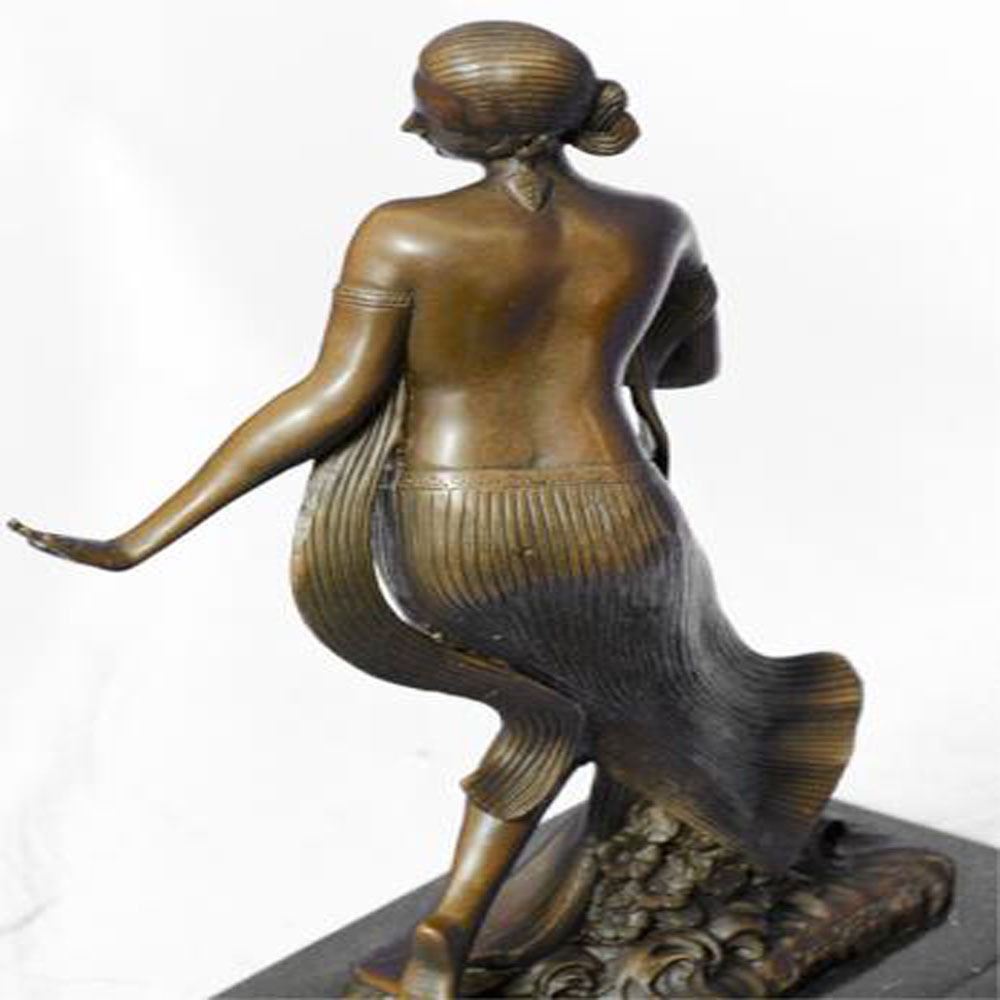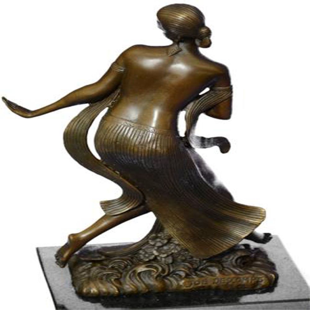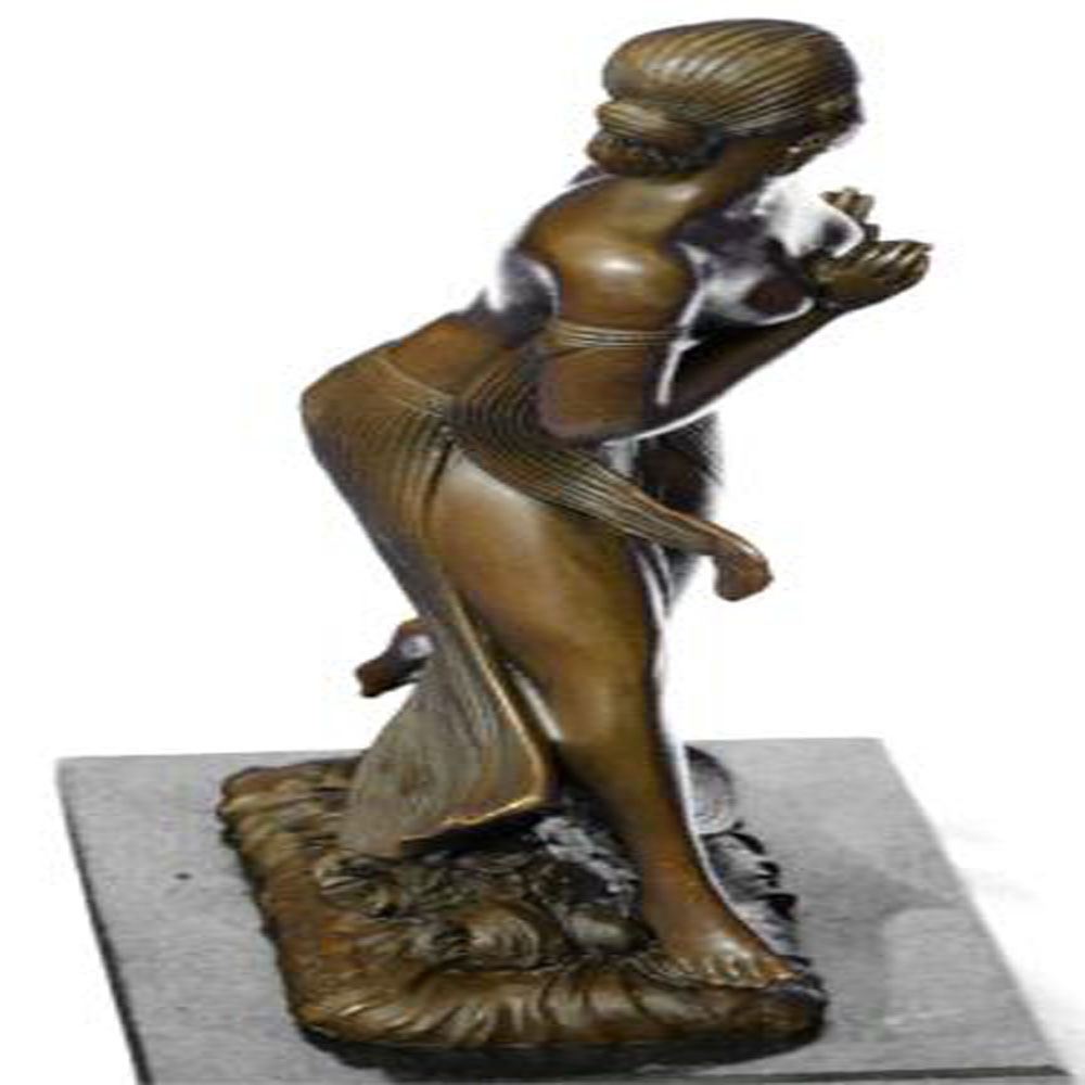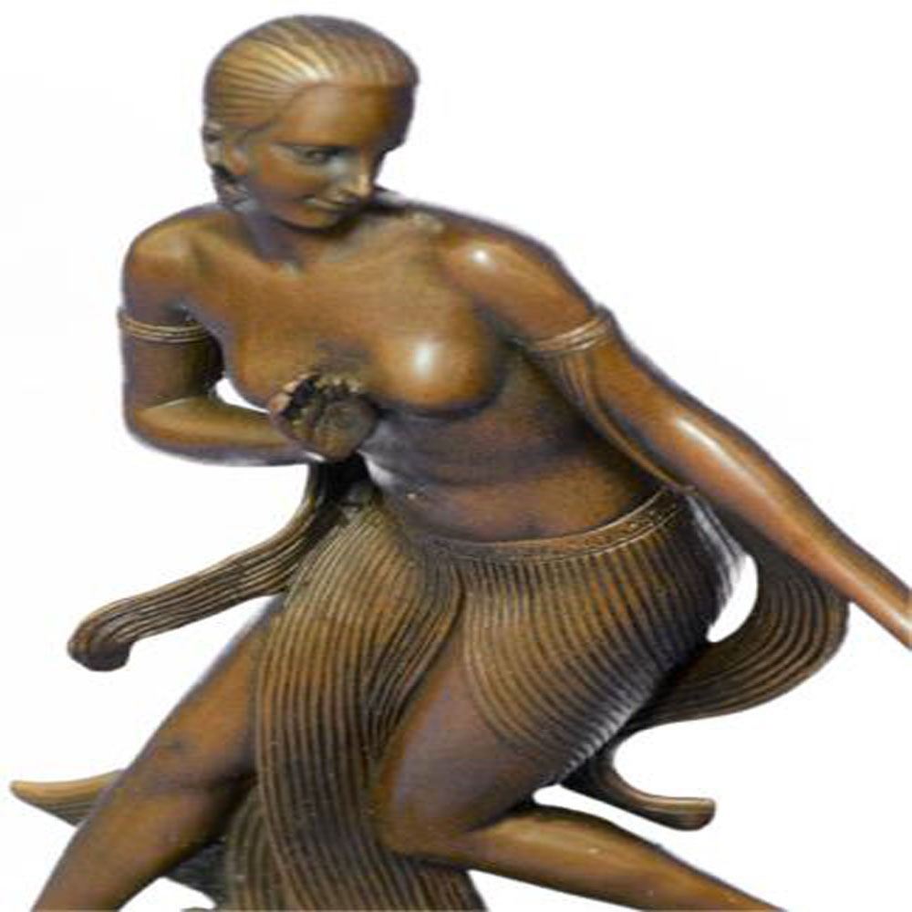 She smiles as she runs through the flower fields she is topless and her skirt flows in the wind as she runs. She wears armbands and attached to them are long flowing clothes that match her skirt. She holds her hands up and back as if she is playfully running away from someone as if they are playing a game. Her hair is tied back showing us her face. She wears earrings and is barefoot as she runs. This Sculpture has gorgeous detail and was cast using the Lost Wax Method and has a two-tone brown patina. It is mounted on a marble base. Dimensions: Height 11 X Width 6 inches. Weight: 8 LBS.