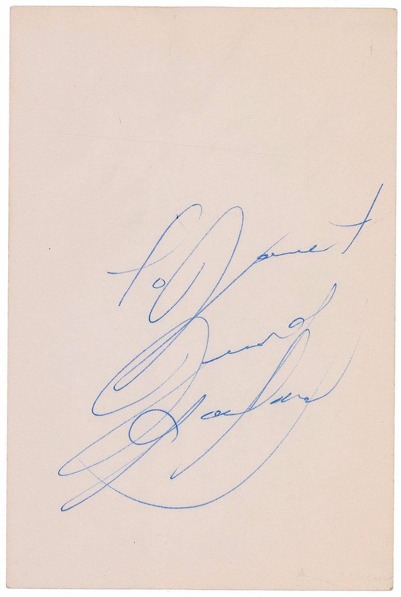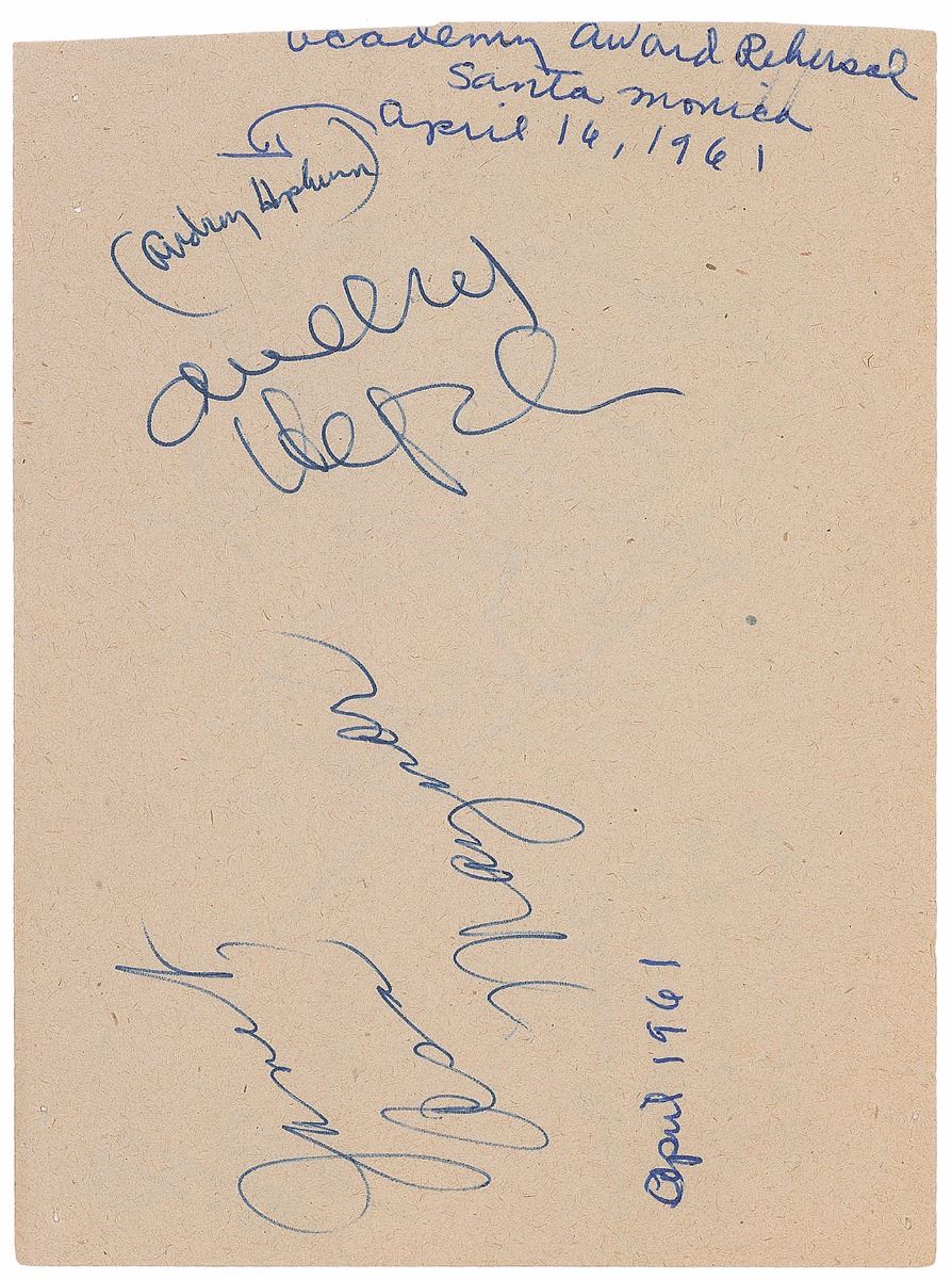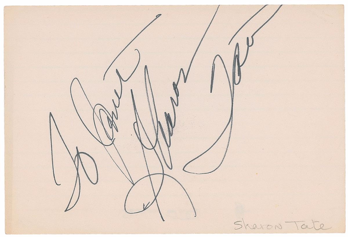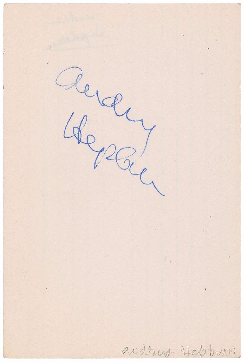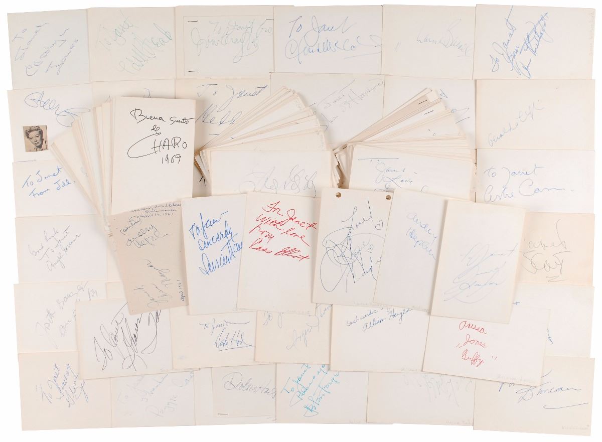 Impressive collection of 132 signatures of various female entertainers on individual cards, including: Sharon Tate, Audrey Hepburn (2), Judy Garland, Jayne Mansfield, Susan Hayward, Gracie Allen, Lauren Bacall, Ann Bancroft, Shirley Booth, Claudia Cardinale, Leslie Caron, June Carter Cash, Cyd Charisse, Claudette Colbert, Jeanne Crain, Joan Crawford, Bette Davis, Lorraine Day, Doris Day, Yvonne De Carlo, Diana Dors, Irene Dunne, Cass Elliott, Linda Evans, Nina Foch, Greer Garson, Janet Gaynor, Katherine Grayson, June Haver, Olivia de Havilland, June Havoc, Edith Head, Tippi Hedren, Sonja Henie, Ruth Hussey, Jeanette MacDonald, Ann Rutherford, Inger Stevens, Vera-Ellen, and nearly one hundred others. In overall fine condition.